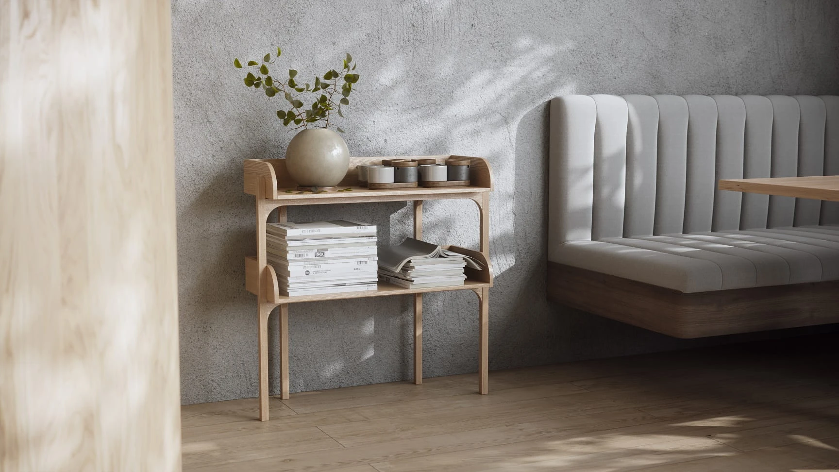 Z wizją połączenia funkcji szafki i lekkości otwartego regału Utility tworzy wszechstronny projekt, który charakteryzuje się miękkimi krzywiznami i łukami. Wykonany