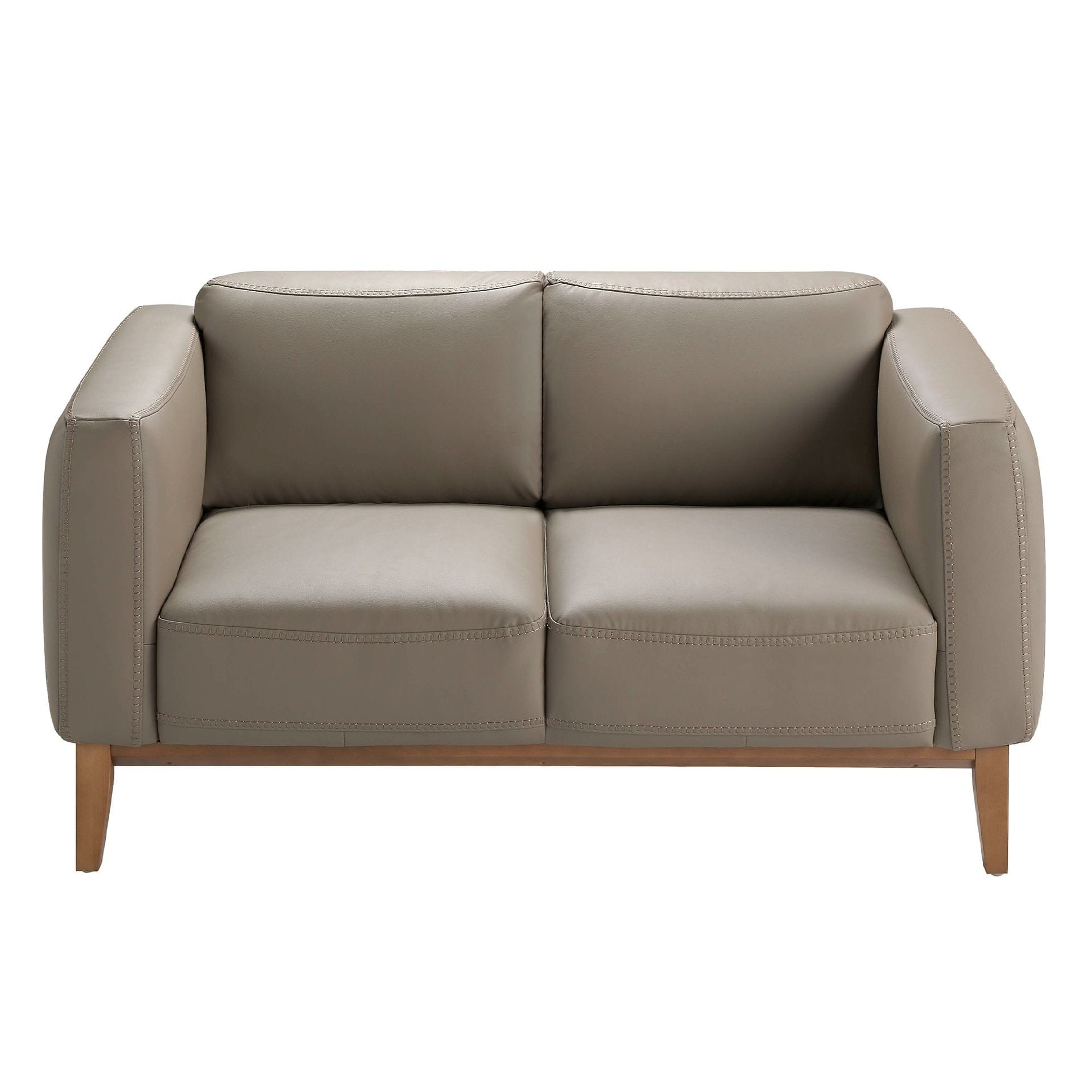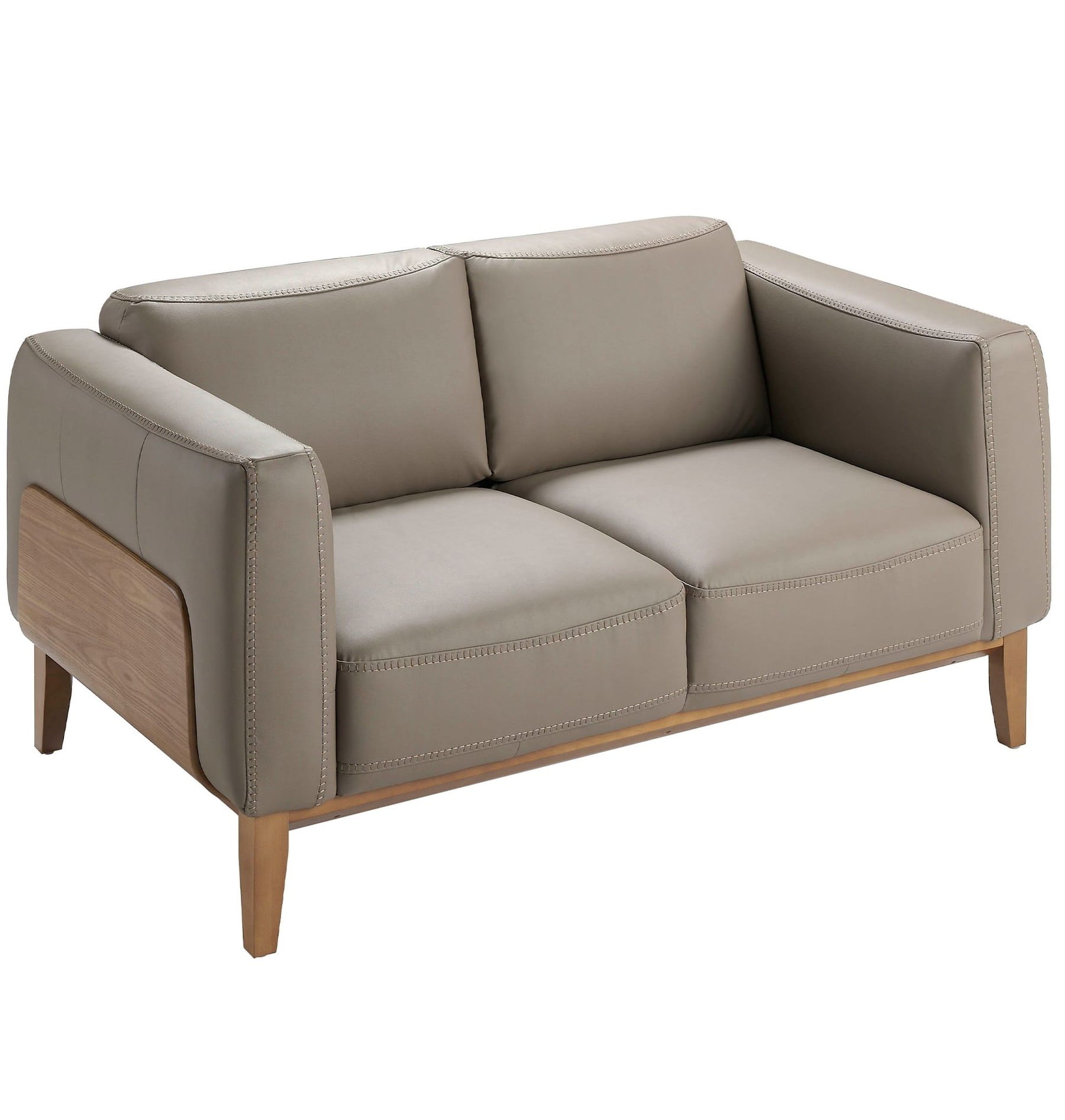 Nowoczesna sofa tapicerowana skórą bydlęcą. Zarówno ze względu na styl, jak i wykończenie z drewna dębowego w kolorze orzecha i drewniane nogi w kolorze orzecha,