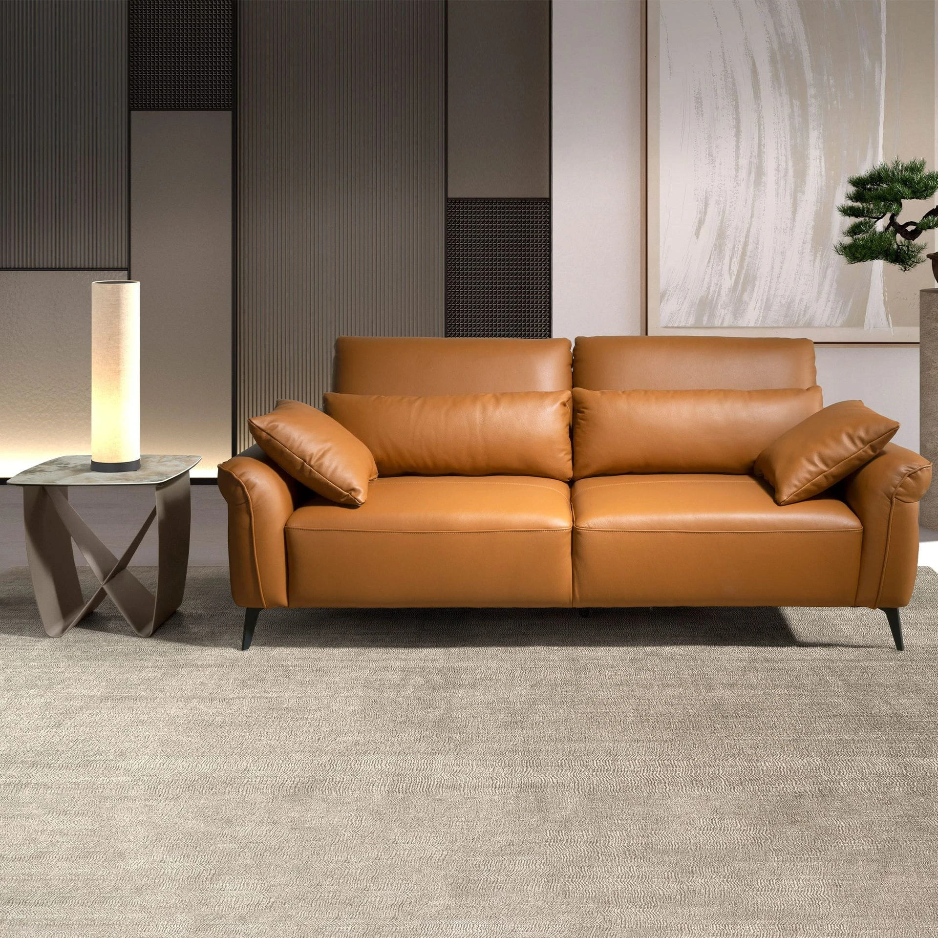 Ta nowoczesna sofa skórzana to doskonałe połączenie stylu, komfortu i funkcjonalności. Jej obszerne, miękkie siedzisko oraz ergonomiczne regulowane zagłówki zapewniają wyjątkową wygodę, dostosowując się do potrzeb użytkownika. Opływowe kształty i eleganckie przeszycia podkreślają jej luksusowy charakter. Tapicerka wykonana z wysokiej jakości skóry naturalnej w odcieniu ciepłego karmelu nadaje wnętrzu przytulności i klasy. Smukłe, metalowe nogi dodają lekkości całej konstrukcji, nadając jej nowoczesny i subtelny wygląd. Dzięki swojemu uniwersalnemu designowi sofa idealnie pasuje do nowoczesnych, skandynawskich i minimalistycznych wnętrz. To idealny wybór do salonu, zapewniający elegancję, wygodę i ponadczasowy styl.