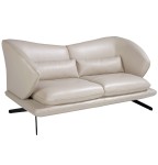 Ta sofa to wyjątkowe połączenie elegancji, futurystycznego designu i najwyższego komfortu. Jej unikalna forma z wyraźnie wyprofilowanymi bokami i wysokim oparciem przywołuje na myśl artystyczną rzeźbę — mebel, który sam w sobie staje się ozdobą wnętrza. Jasna tapicerka wykonana ze skóry naturalnej lub wysokogatunkowej ekoskóry nadaje całości luksusowego charakteru, a miękkie poduchy siedziska i dodatkowe podłużne wałki zapewniają doskonałe podparcie nie tylko dla pleców, ale i lędźwi. Lekka, niemal lewitująca forma została subtelnie podkreślona przez smukłe, czarne, metalowe nogi, które kontrastują z jasną barwą obicia, dodając całości lekkości i nowoczesności. To idealna sofa dla tych, którzy cenią odważne, nowatorskie projekty i chcą nadać swojemu salonowi wyjątkowego charakteru.