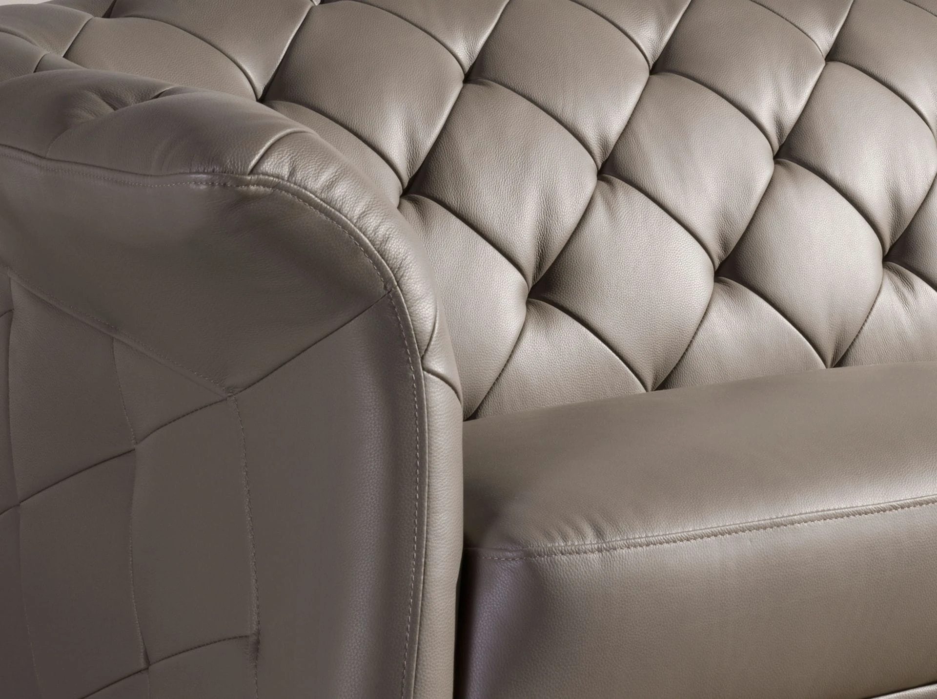 Sofa Chester o nowoczesnym wzornictwie, tapicerowana szarą skórą bydlęcą. Zarówno ze względu na styl, jak i drewniane nogi w kolorze orzecha, ta sofa wniesie odrobinę