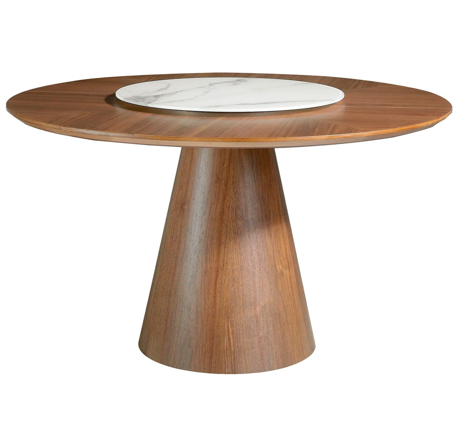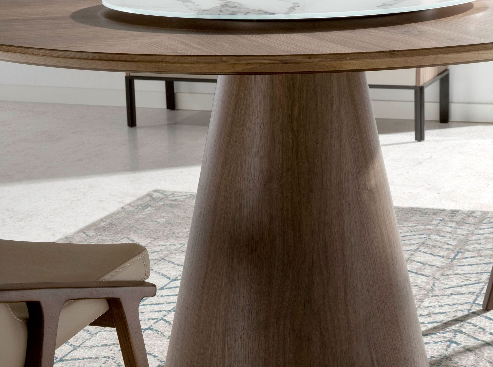 Okrągły stół obrotowy o nowoczesnym designie ze stałym blatem z naturalnego drewna fornirowanego orzechem włoskim o grubości 0,5 mm. Jest odporny i trwały, oferując nowoczesny