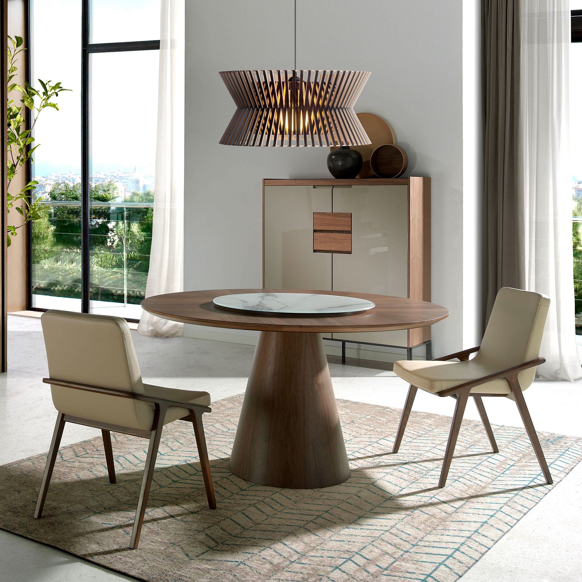 Nadaje się dla maksymalnie 6 osób. Oryginalne centrum obrotowe z białej marmurowej porcelany o grubości 6 mm umożliwi wszystkim gościom dostęp do naczyń znajdujących się na stole