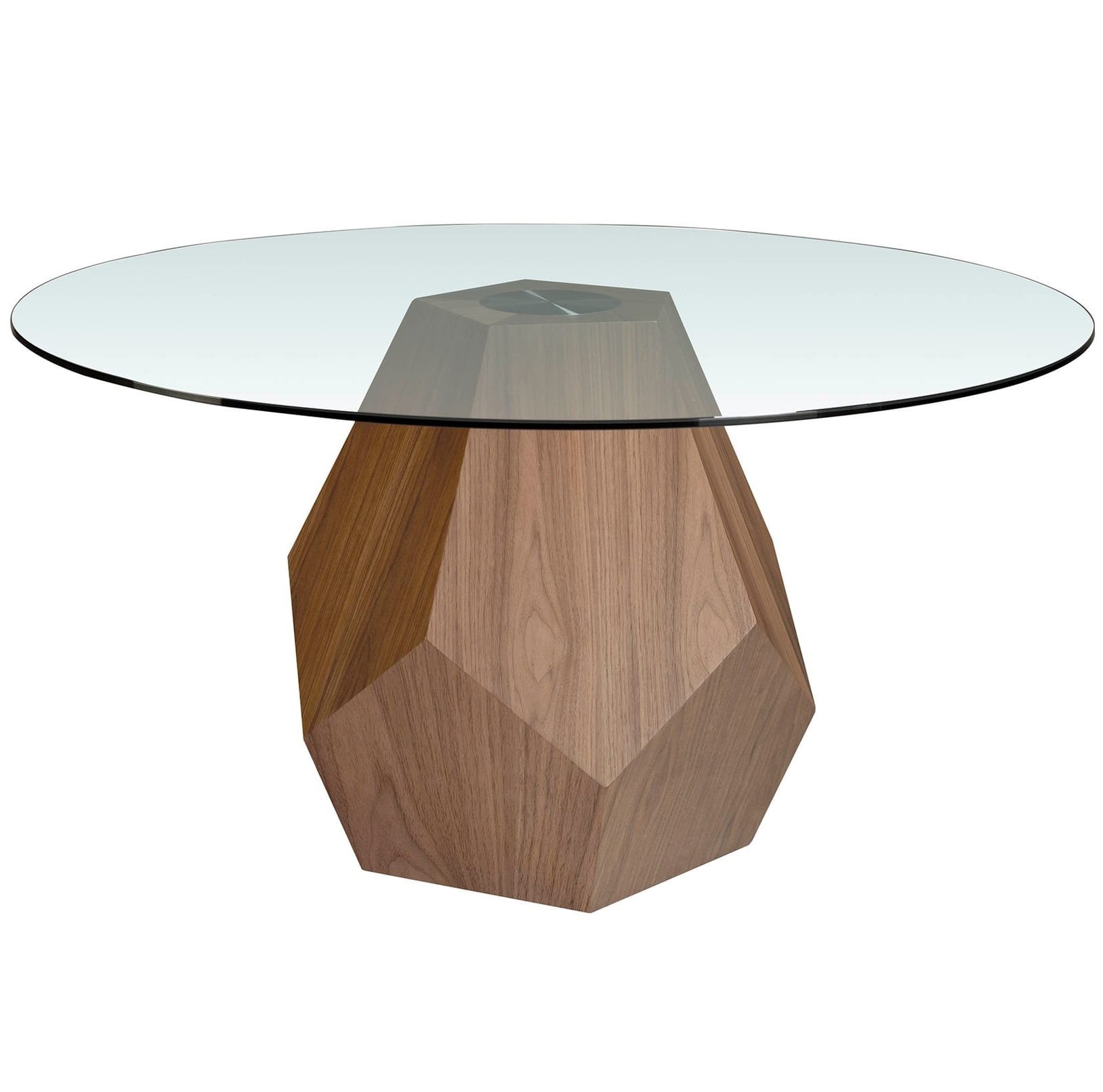 Nowoczesny okrągły stół do jadalni z blatem ze szkła hartowanego. Kluczowym elementem projektu są oryginalne, drewniane nogi w kolorze orzecha. Blat ze szkła