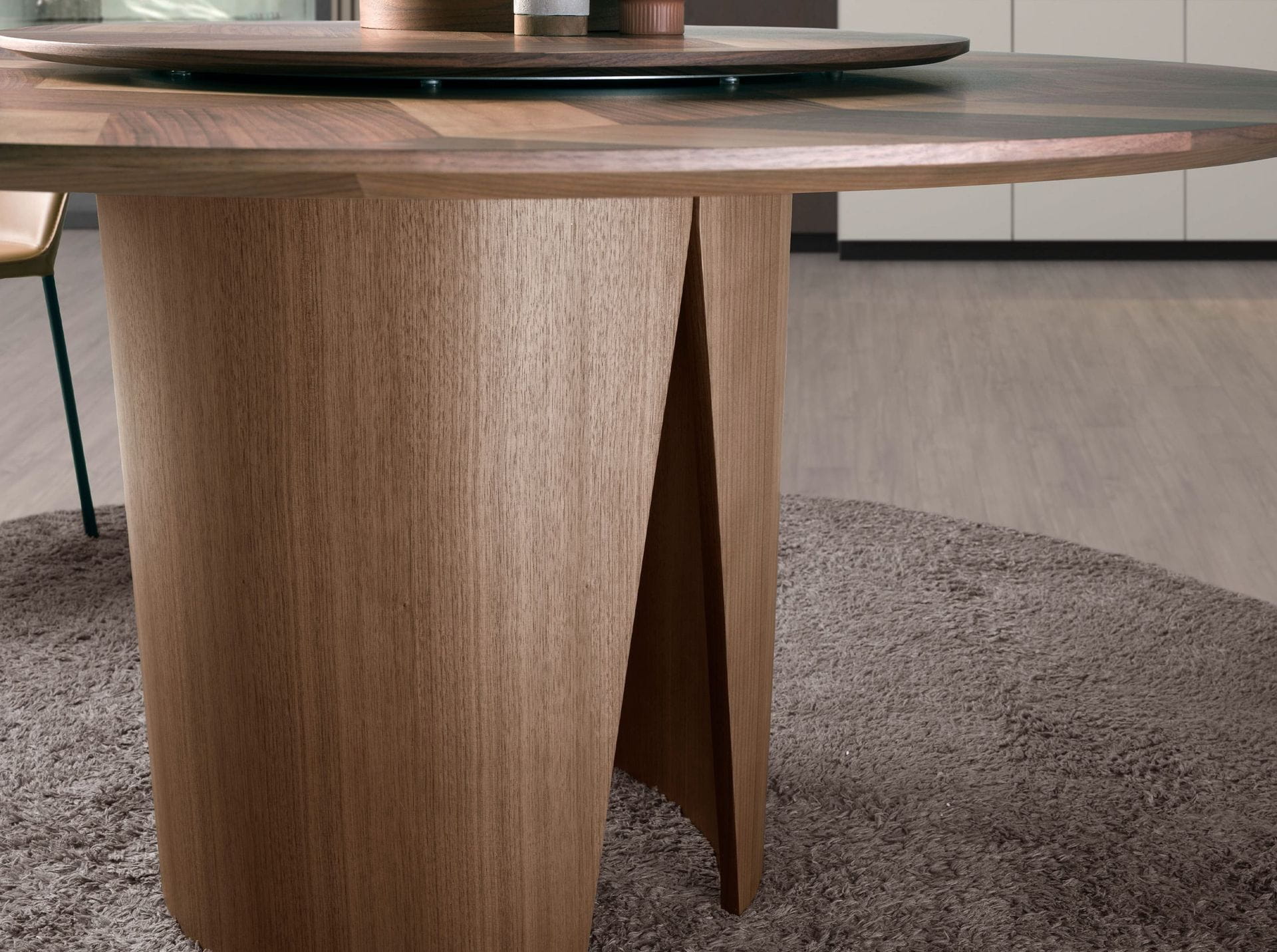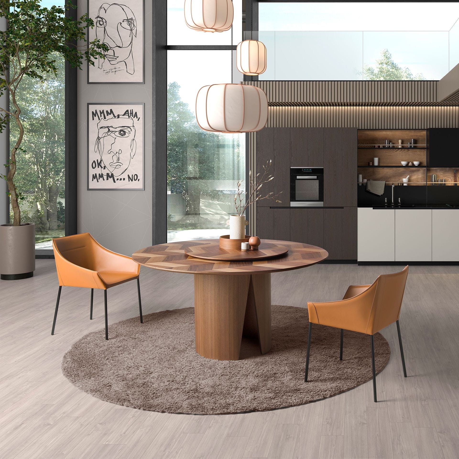 Okrągły stół o nowoczesnym designie z blatem fornirowanym naturalnym orzechem. Idealny stół, który wprowadzi odrobinę awangardy do Twojej kuchni, salonu