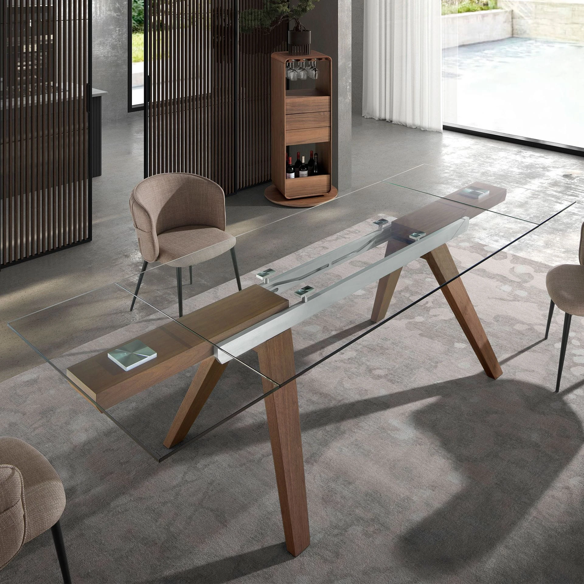 Szklana powierzchnia rozpościera się niczym spokojna tafla wody – przejrzysta, pełna światła, otwarta na przestrzeń wokół. Pod nią ciepło fornirowanego drewna