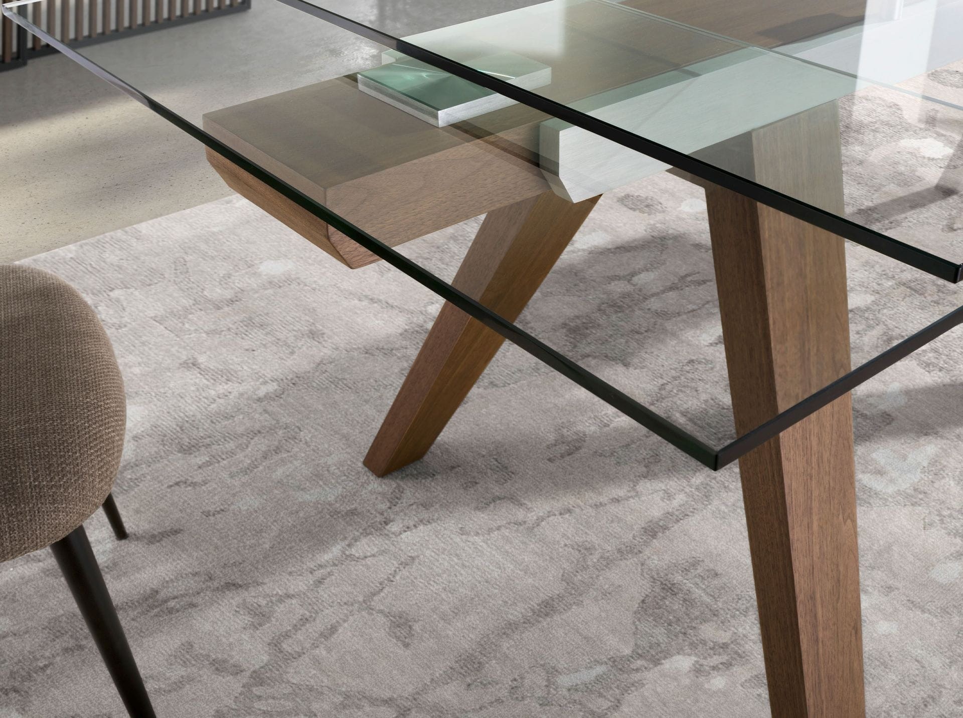 przełamuje chłód szkła, wprowadzając równowagę między nowoczesnością a przytulnością. Skośne nogi w ciepłym odcieniu orzecha opierają się z pewnością