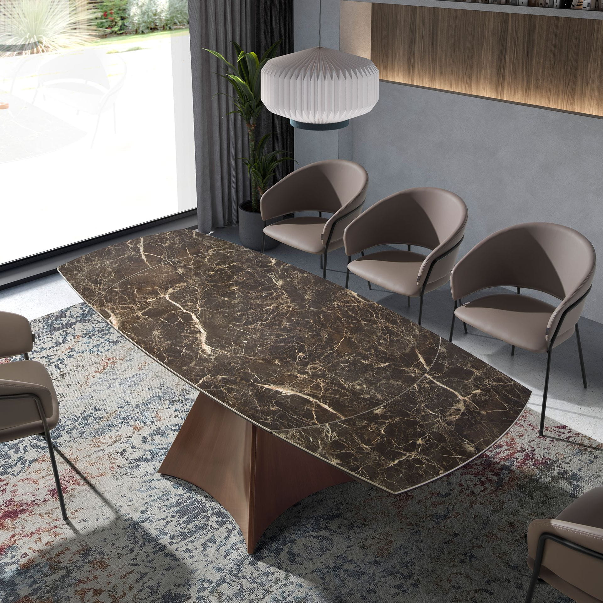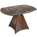 Ciemny porcelanowy marmur, przecięty złotawymi żyłkami, przywołuje na myśl burzowe niebo tuż przed zmierzchem — dramatyczny, głęboki, pełen tajemnicy. Jego organiczny rysunek kontrastuje z geometryczną formą podstawy, której delikatnie wygięte linie przypominają rozchylające się skrzydła. Stal nierdzewna imitująca drewno w ciepłym, orzechowym tonie otula całość subtelnym światłem, dodając konstrukcji wrażenia miękkości. To stół, który łączy monumentalność z elegancją, a rzeźbiarska podstawa czyni z niego coś więcej niż mebel — staje się on punktem skupienia, miejscem spotkań i rozmów osadzonym w sztuce formy.