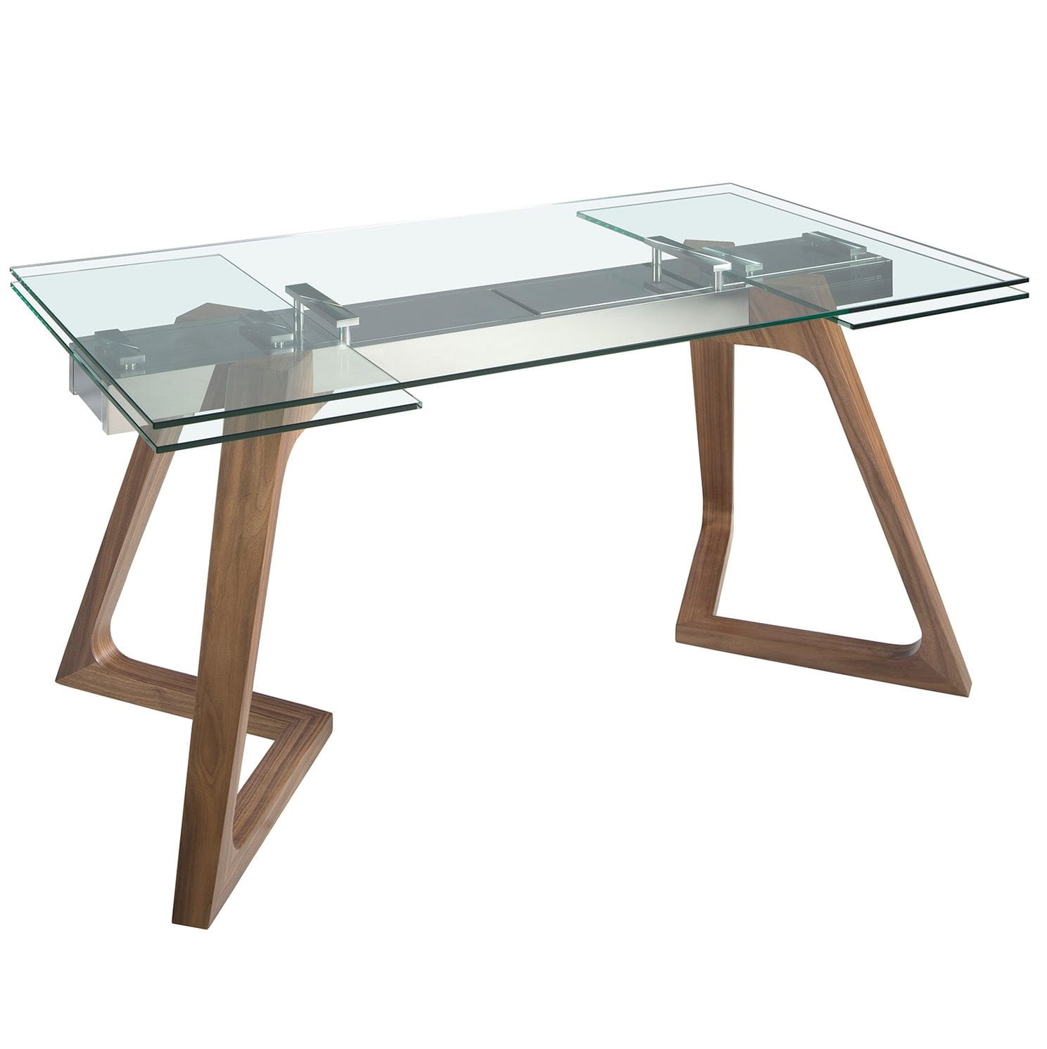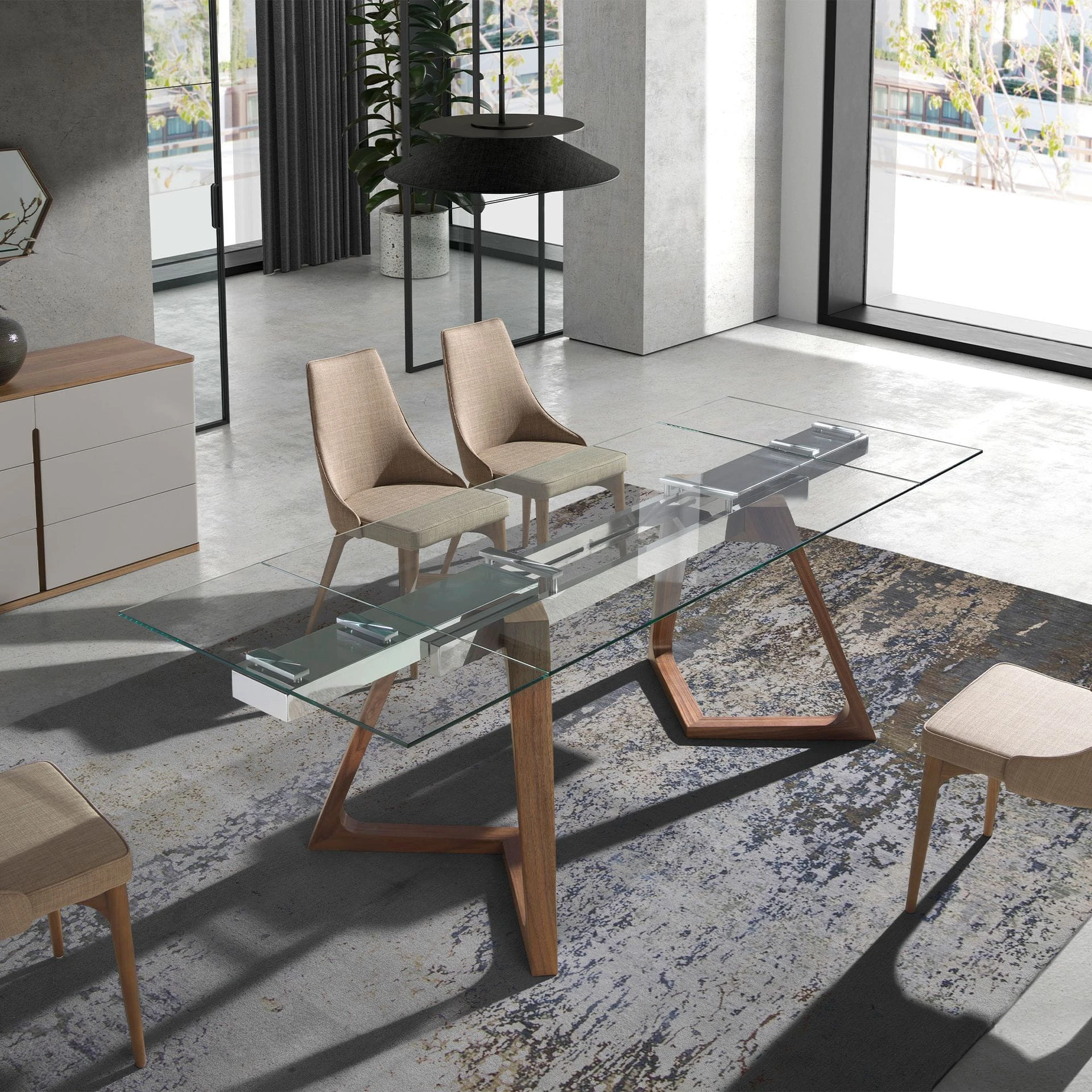 Szklany blat o krystalicznej przejrzystości zdaje się unosić w powietrzu, subtelnie oparty na nogach z drewna o głębokim, naturalnym usłojeniu. Geometryczna, lekko pochylona forma podstawy nadaje całości wizualnej lekkości, przywołując skojarzenia z nowoczesną rzeźbą, która w nieoczywisty sposób łączy dynamikę i harmonię. Transparentna powierzchnia nie tylko eksponuje elegancką konstrukcję, lecz także wprowadza do wnętrza aurę przestronności i światła. To mebel, który z łatwością zmienia swoje oblicze – dzięki rozsuwanym panelom szklanego blatu można zaaranżować większą powierzchnię, gotową na spotkania w gronie rodziny czy przyjaciół. Metalowe elementy konstrukcyjne błyszczą subtelnym refleksem i dyskretnie podkreślają współczesny charakter stołu. Zestawienie szlachetnego drewna z chłodną elegancją szkła tworzy wyjątkowy kontrast – pełen wyrafinowanego spokoju i nowoczesnego luksusu. Każdy detal został dopracowany z myślą o codziennym komforcie i estetycznej przyjemności – to nie tylko funkcjonalny stół, lecz również kompozycja, która potrafi nadać przestrzeni wyjątkowy, niepowtarzalny ton.