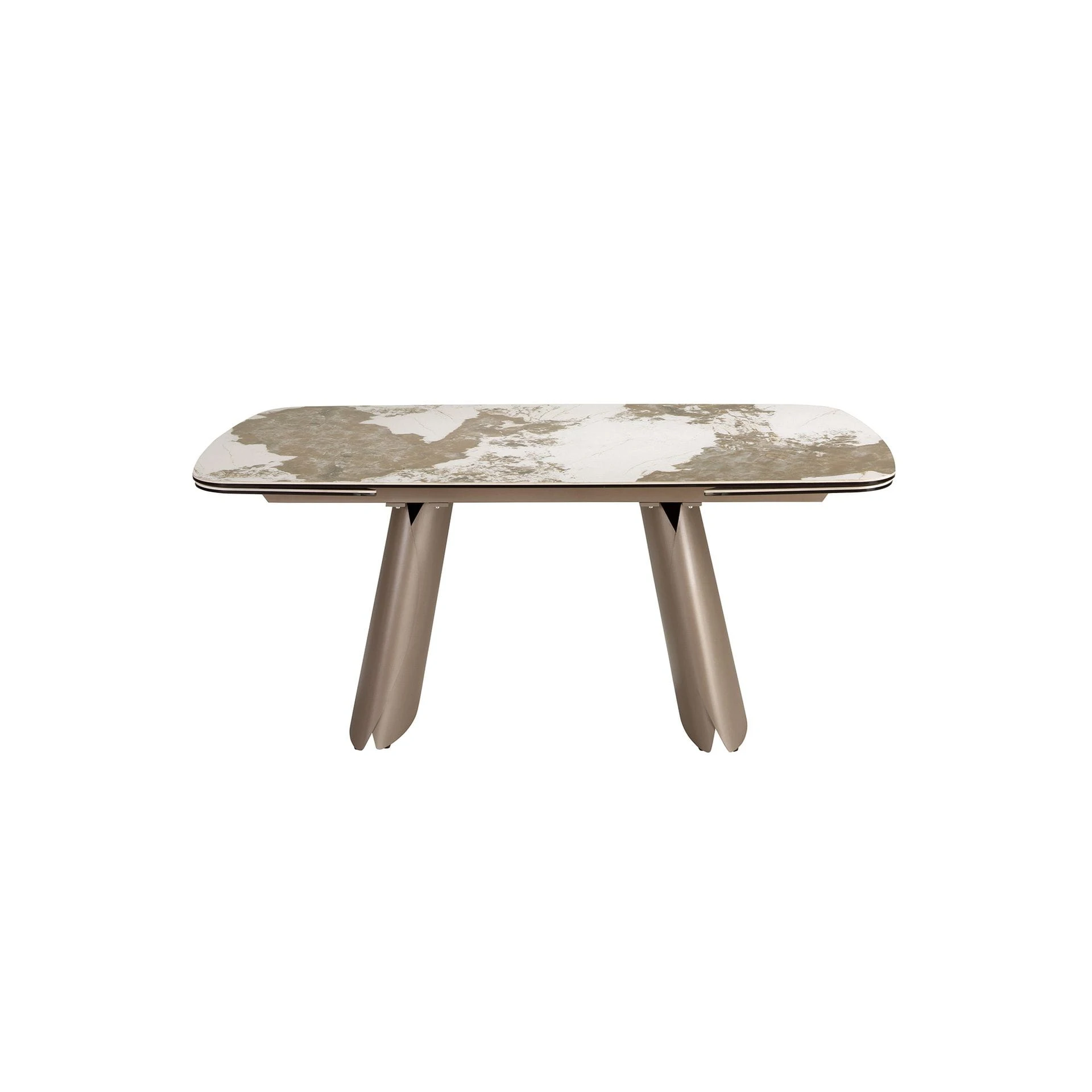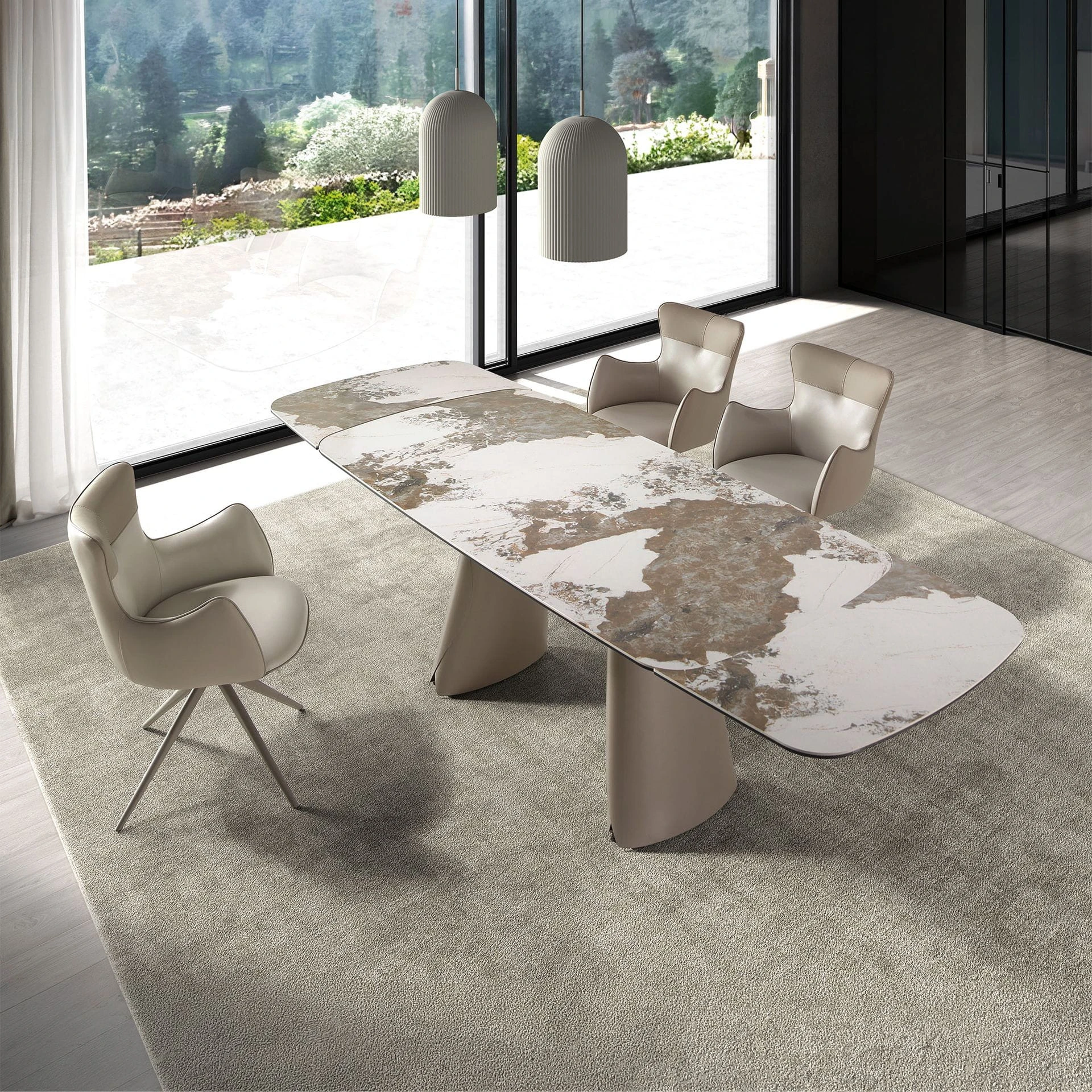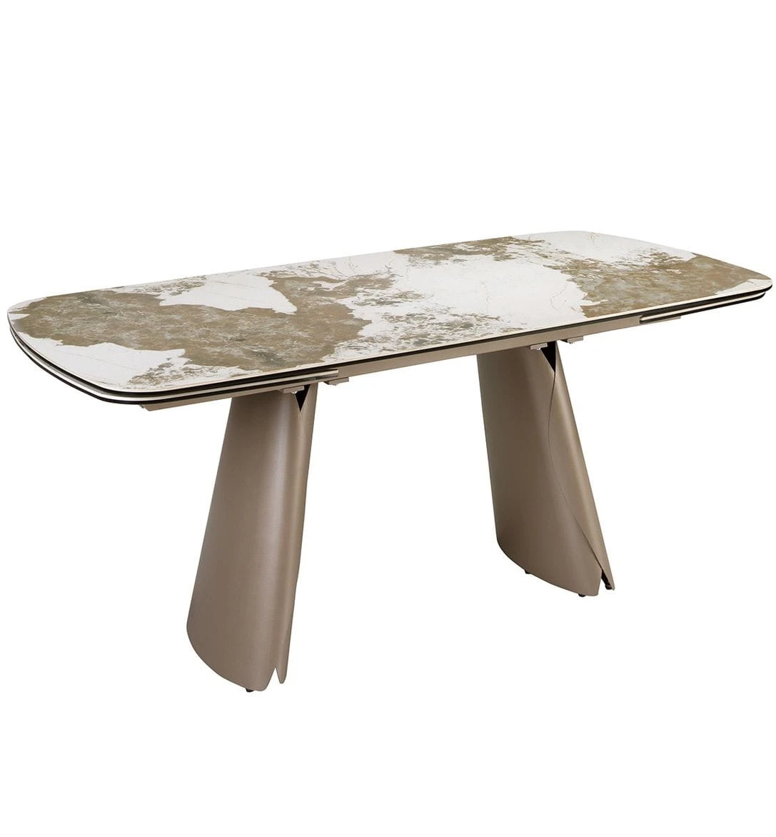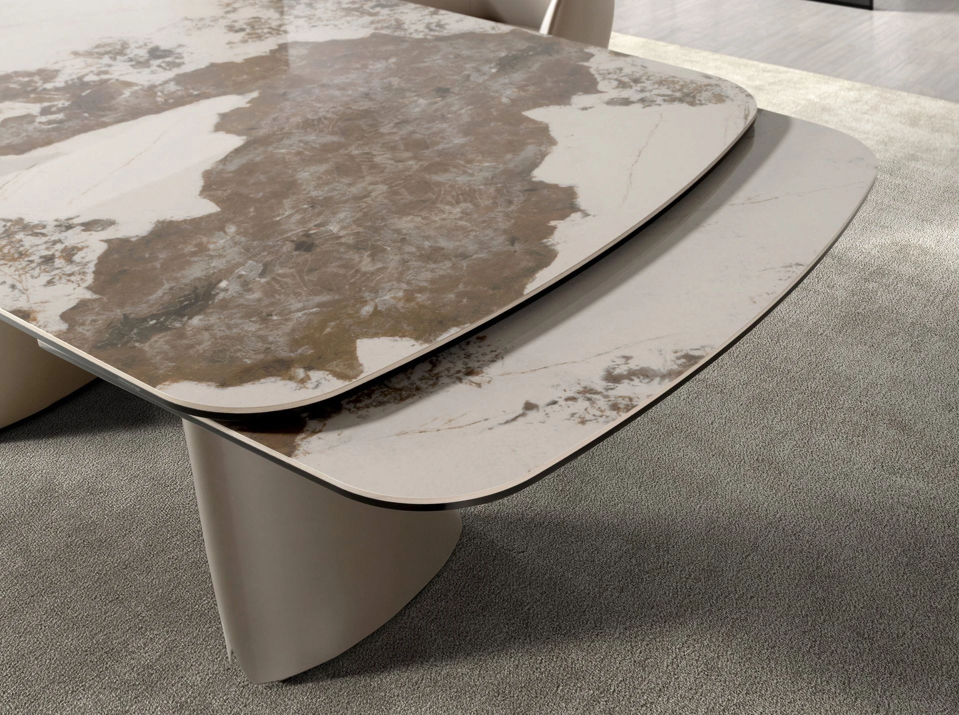 Wyważona forma i wyrafinowana materia spotykają się tu w spokojnej, eleganckiej kompozycji. Owalny blat przyciąga spojrzenie subtelnym rysunkiem przypominającym naturalny kamień – jakby powierzchnia została delikatnie „namalowana” przez czas i naturę. Pod nim rozgrywa się druga opowieść – rzeźbiarskie podstawy o miękkiej, płynnej linii. Ich forma, lekko rozchylona i dynamiczna, nadaje całości lekkości, mimo solidnej konstrukcji. To właśnie ten kontrast – między stabilnością a wizualną delikatnością – buduje charakter mebla. Rozkładana funkcja sprawia, że stół płynnie dopasowuje się do rytmu codzienności – od kameralnych chwil po większe spotkania. Mechanizm pozostaje dyskretny, niemal niewidoczny, pozwalając formie zachować czystość. To propozycja dla wnętrz, które cenią równowagę – między nowoczesnością a ponadczasową elegancją, między funkcją a estetyką.