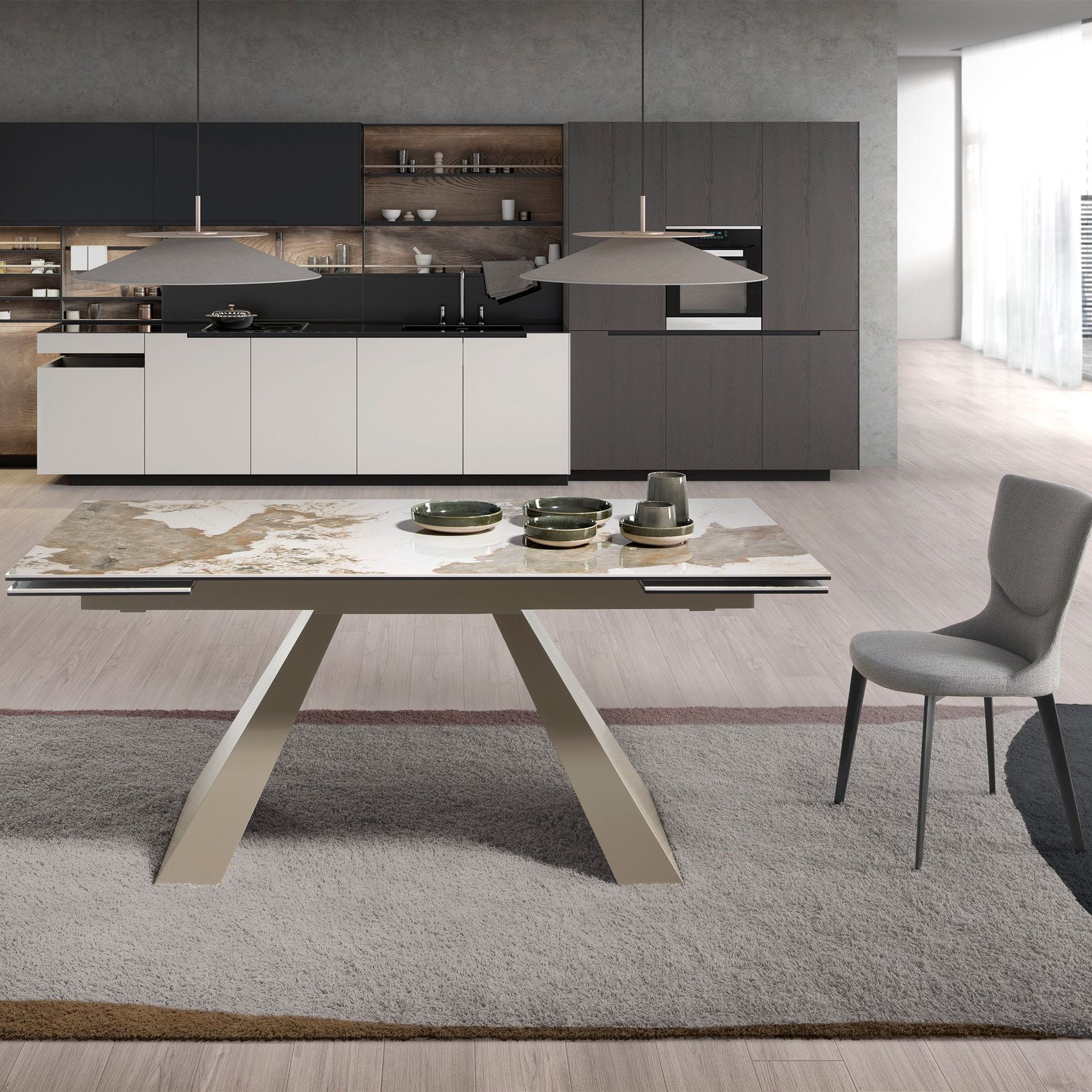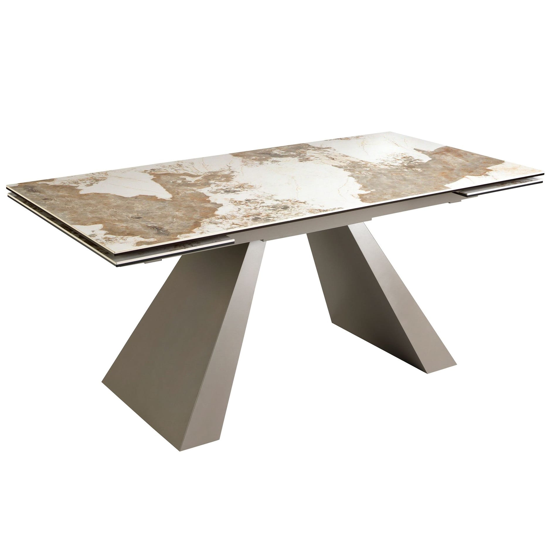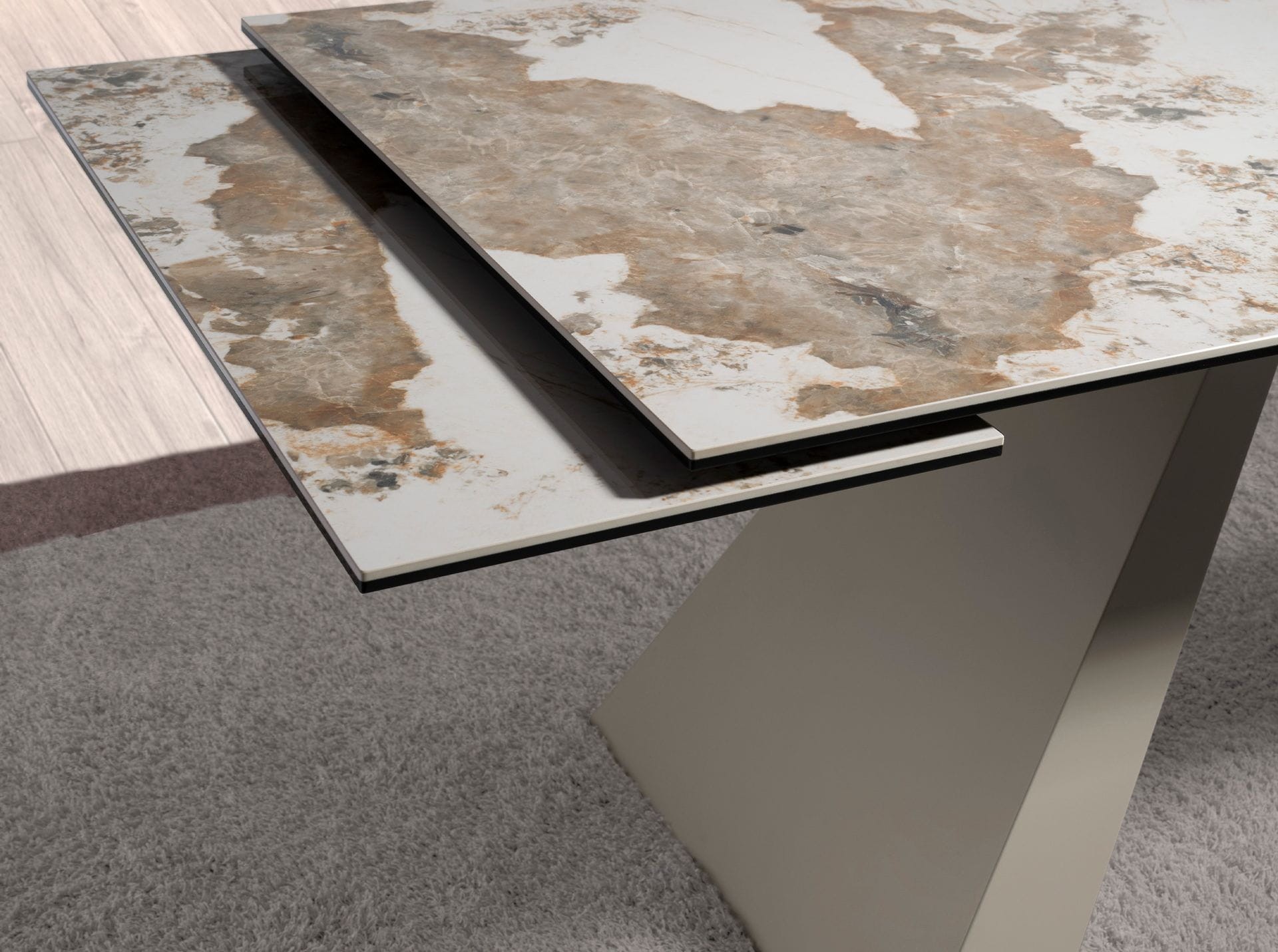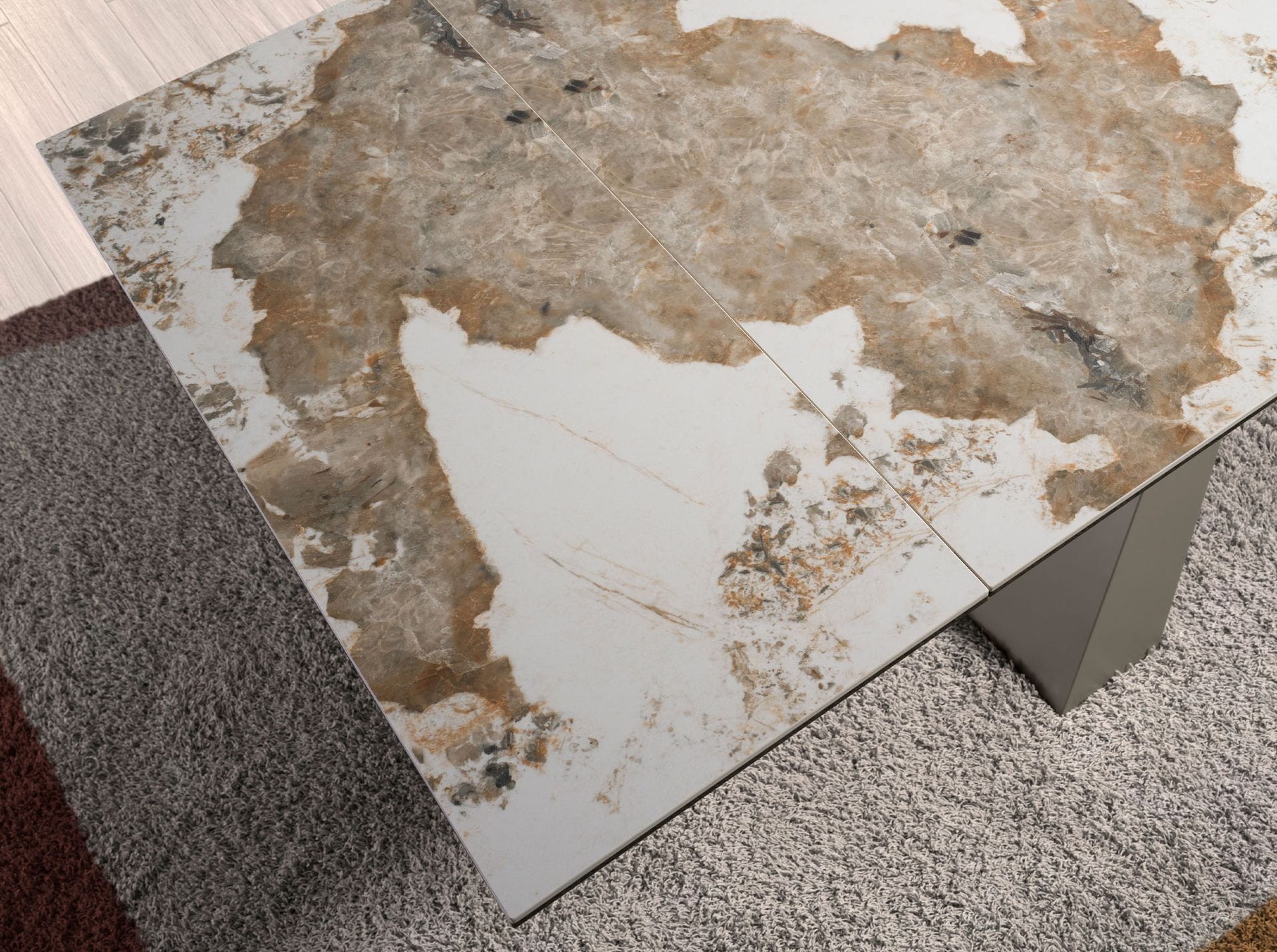 Prostokątny rozkładany stół do jadalni o nowoczesnym designie z blatem z białego porcelanowego marmuru z żyłkami w odcieniach ziemi i błyszczącym wykończeniem.