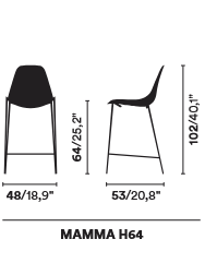 Wydłużona sylwetka Mammamia High unosi znaną linię kultowego krzesła ku nowej proporcji — smukłej, lekkiej i wyrafinowanej. Projekt Marcello Zilianiego zachowuje płynność charakterystycznych krzywizn, pozwalając im rozciągnąć się w eleganckiej formie stołka, który zdaje się niemal rysować przestrzeń delikatnym konturem. Odlewane aluminiowe siedzisko spoczywa na stalowej konstrukcji, tworząc subtelne napięcie pomiędzy lekkością wizualną a stabilnością materiału. Różnorodne wykończenia nadają mu odmienne osobowości — od surowej faktury inspirowanej betonem i brązem, przez świetlistość powierzchni pokrytych płatkami metalu, aż po lustrzaną, ręcznie polerowaną taflę odbijającą otoczenie. Nowoczesna zaprawa Corkcrete wnosi dodatkowo współczesny wymiar odpowiedzialnego projektowania. Tapicerowane siedzisko, dostępne w tkaninach i skórach, pozwala wprowadzić miękkość i indywidualny charakter, a lakierowana konstrukcja w kolorach RAL subtelnie dopełnia całość. Mammamia High staje się dzięki temu nie tylko funkcjonalnym elementem wyposażenia, lecz elegancką linią wpisaną w przestrzeń — spokojną, wyważoną i ponadczasową.