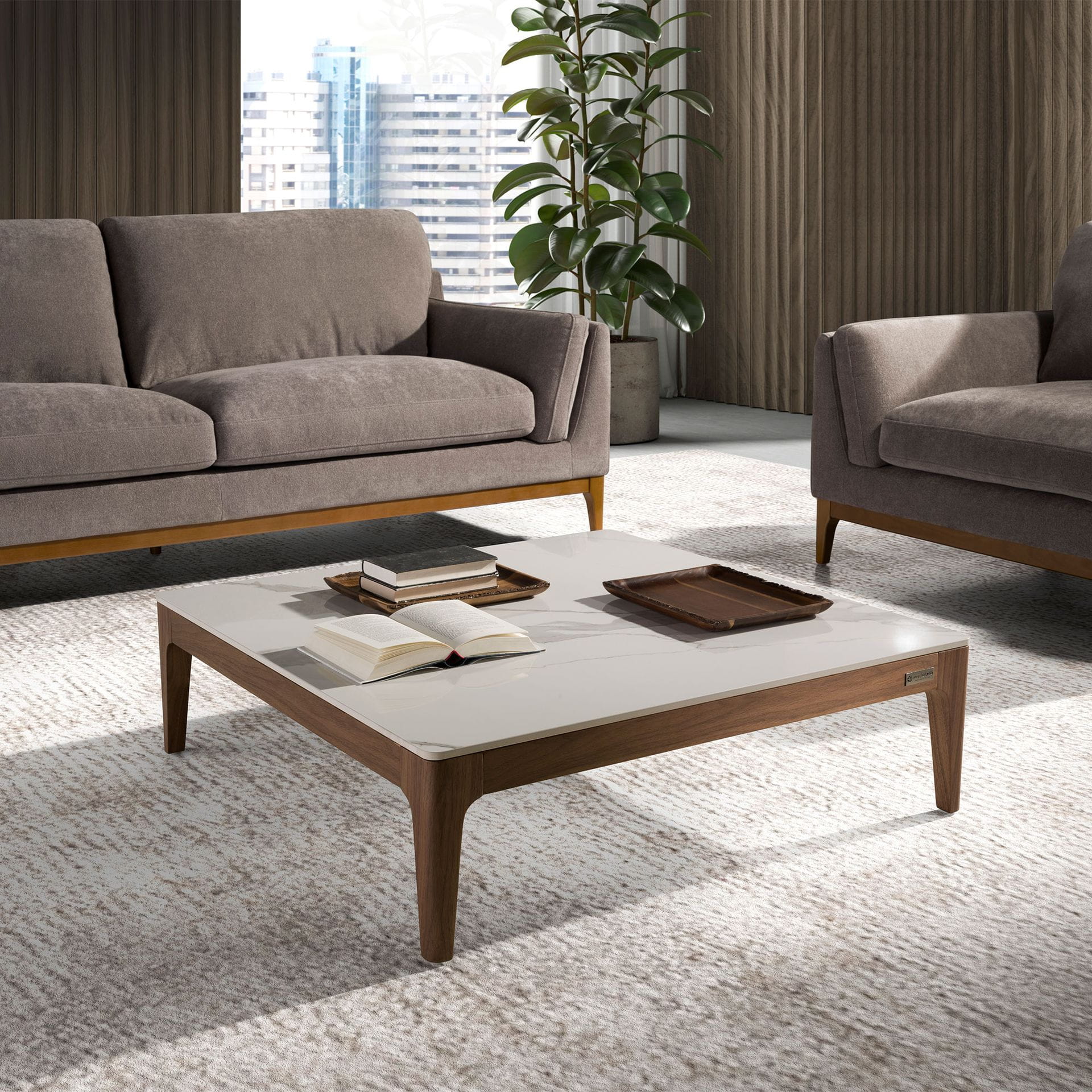 Kwadratowy stolik kawowy o nowoczesnym designie z blatem z białego porcelanowego marmuru z szarymi żyłkami w błyszczącym wykończeniu i oryginalnymi drewnianymi