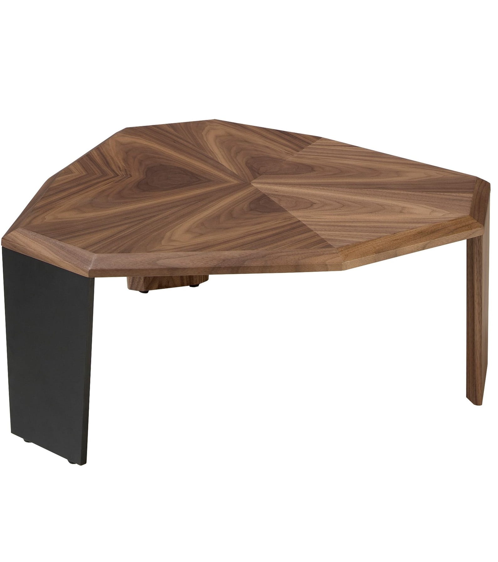 Asymetryczny stolik kawowy o nowoczesnym designie z drewnianym blatem fornirowanym naturalnym orzechem i oryginalnymi nogami z czarnego PCV oraz drewna
