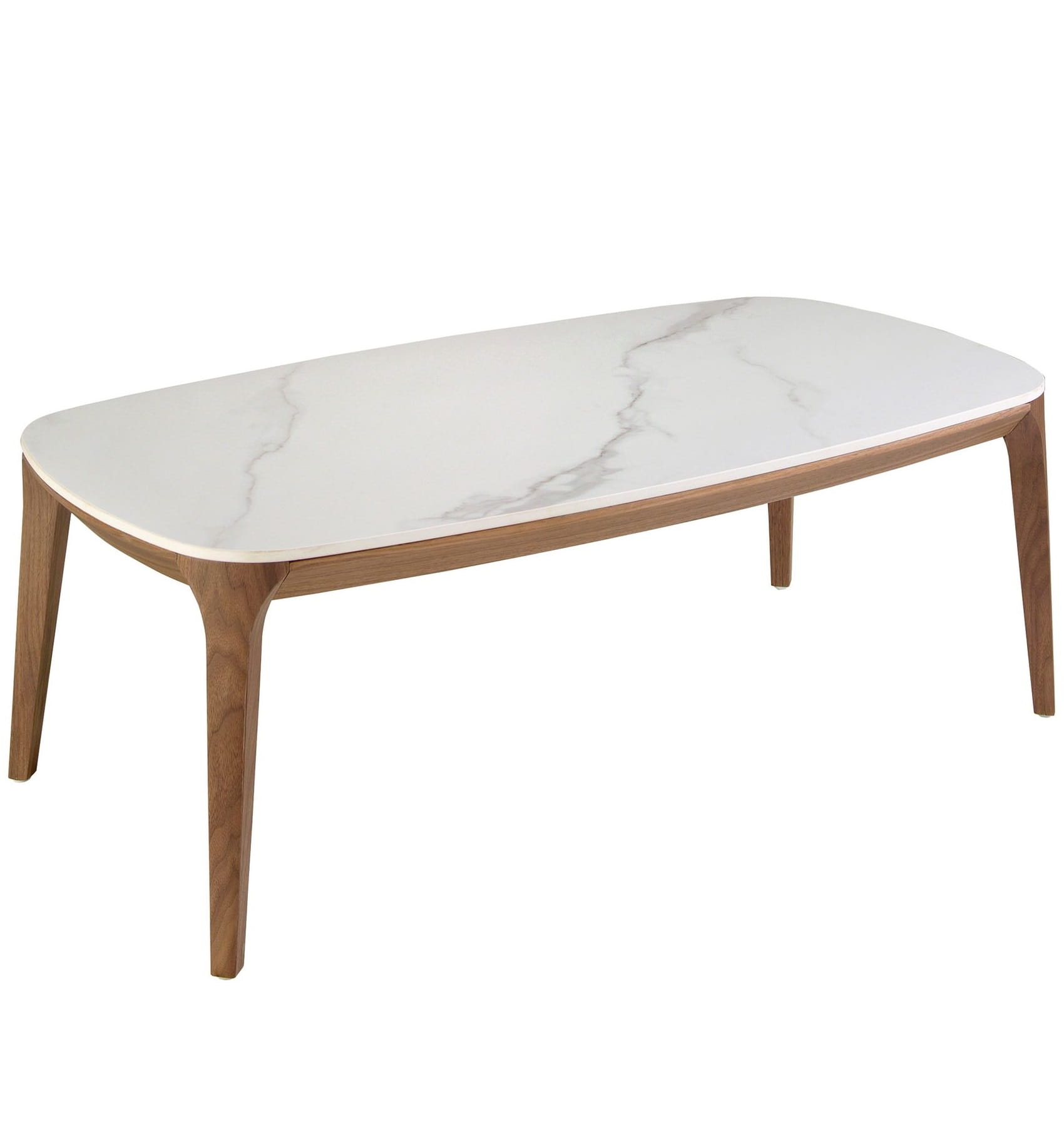 Prostokątny stolik kawowy o nowoczesnym designie z blatem z białego porcelanowego marmuru z szarymi żyłkami w błyszczącym wykończeniu i oryginalnymi drewnianymi