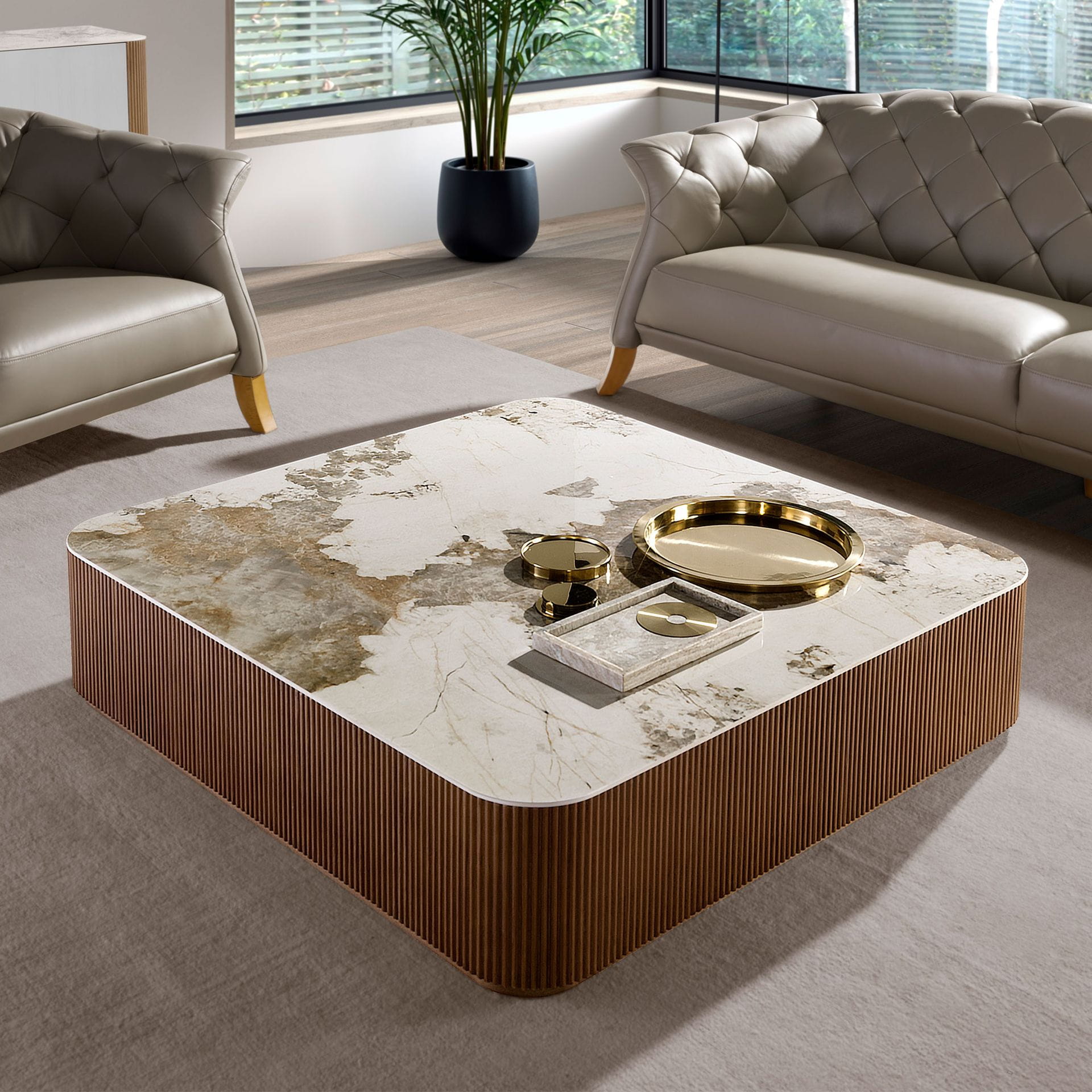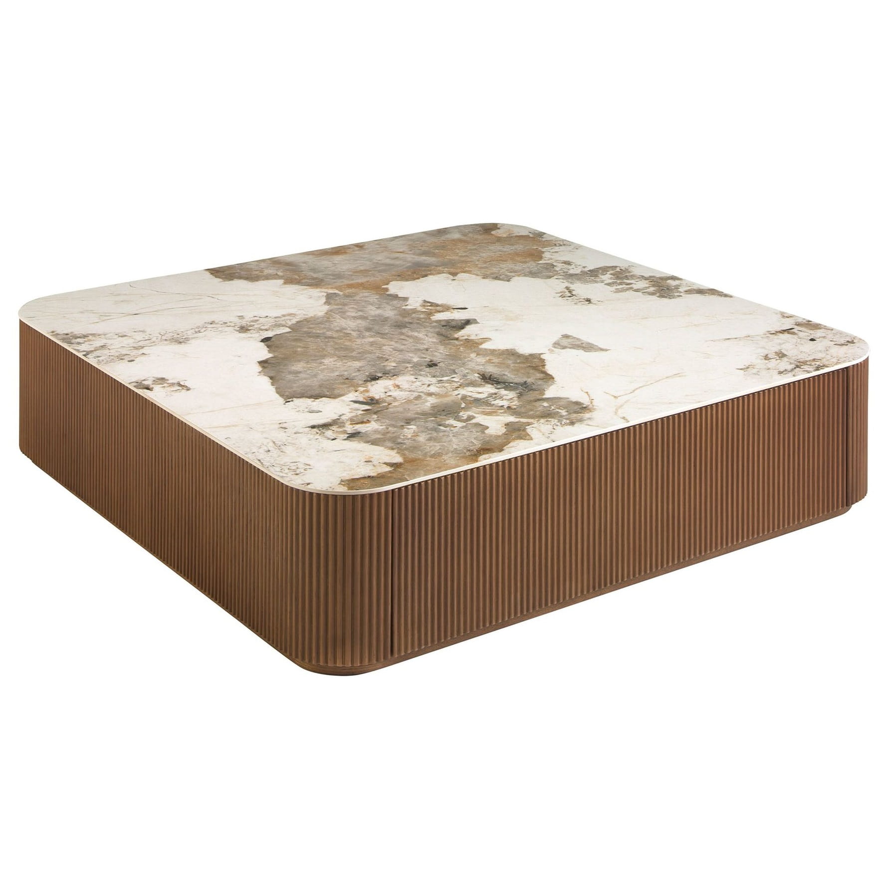 Kwadratowy stolik kawowy o nowoczesnym designie wykonany z drewna w kolorze orzecha i eleganckiego blatu z porcelanowego marmuru z żyłkami w odcieniach ziemi