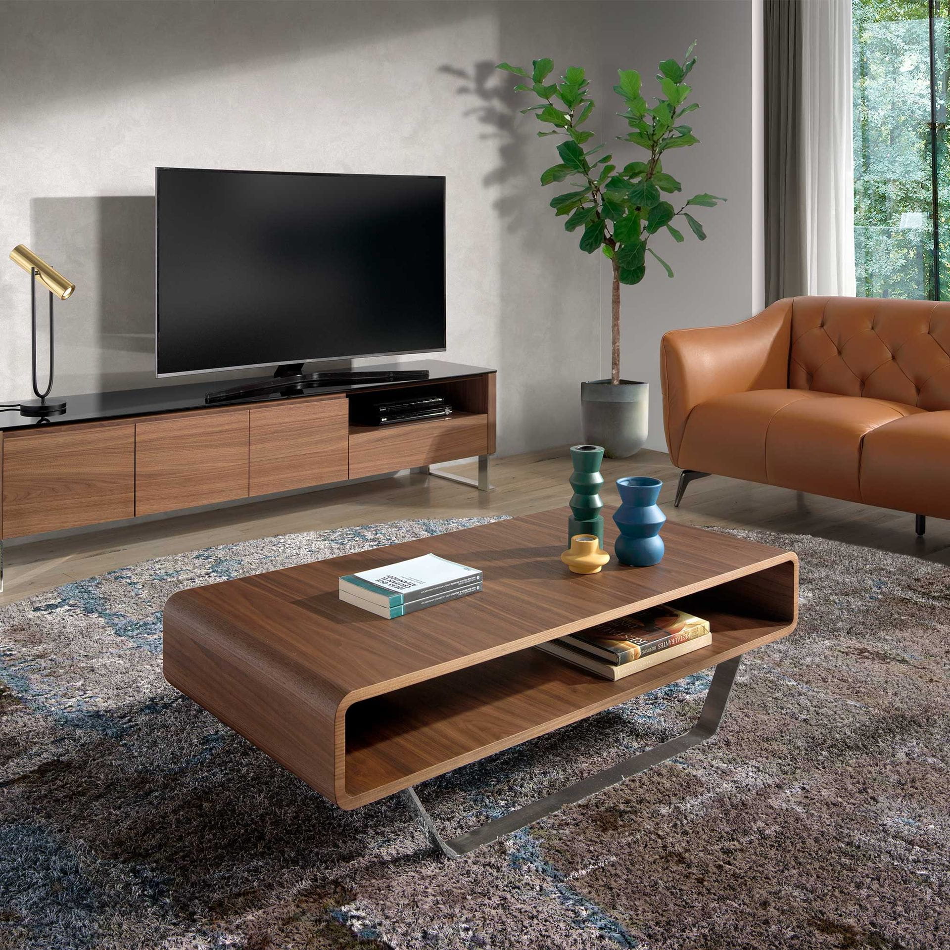 Prostokątny stolik kawowy o nowoczesnym designie, wykonany z naturalnego drewna fornirowanego orzechem. Konstrukcja z chromowanych nóg ze stali nierdzewnej