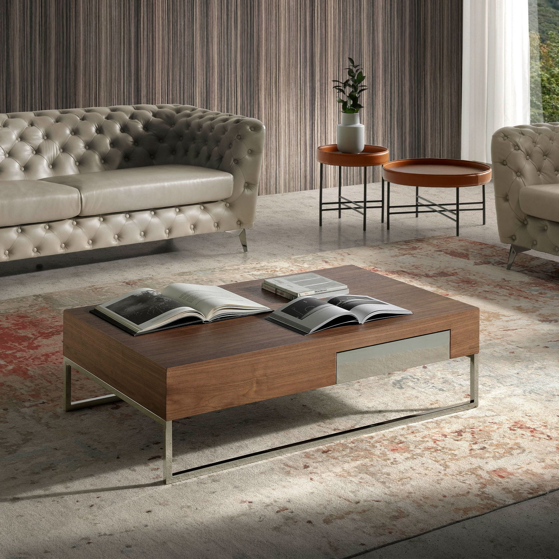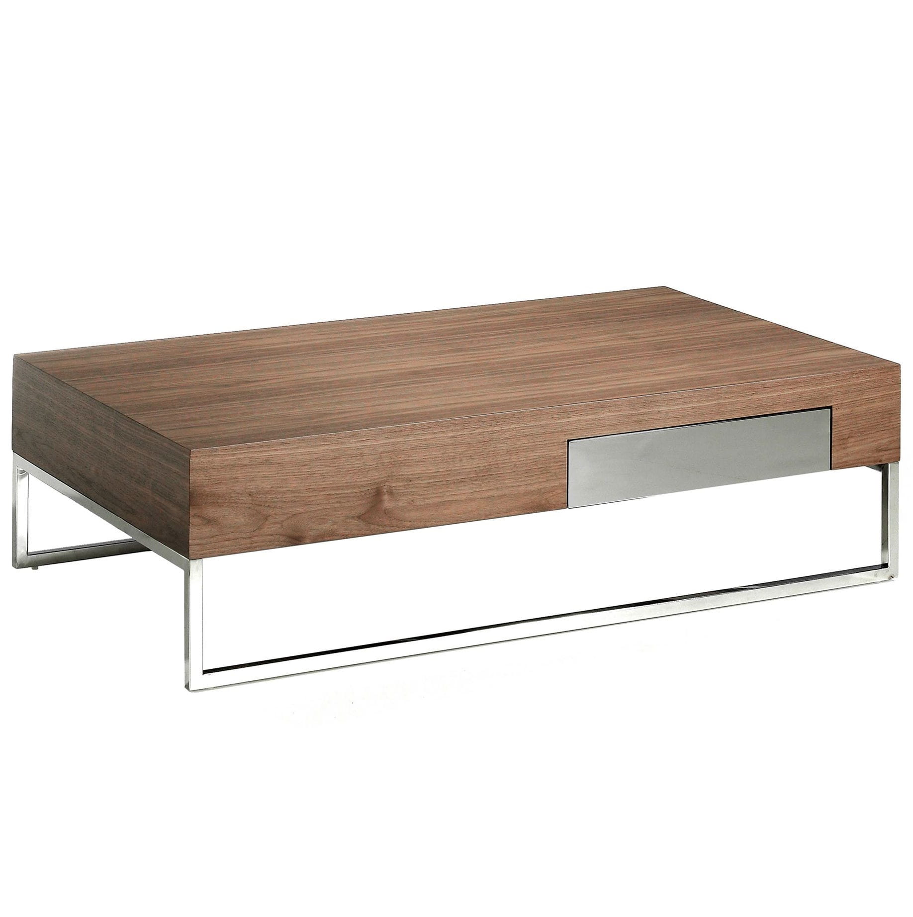 Prostokątny stolik kawowy o nowoczesnym designie, wykonany z drewna fornirowanego w kolorze naturalnego orzecha. Konstrukcja z chromowanych nóg ze stali nierdzewnej