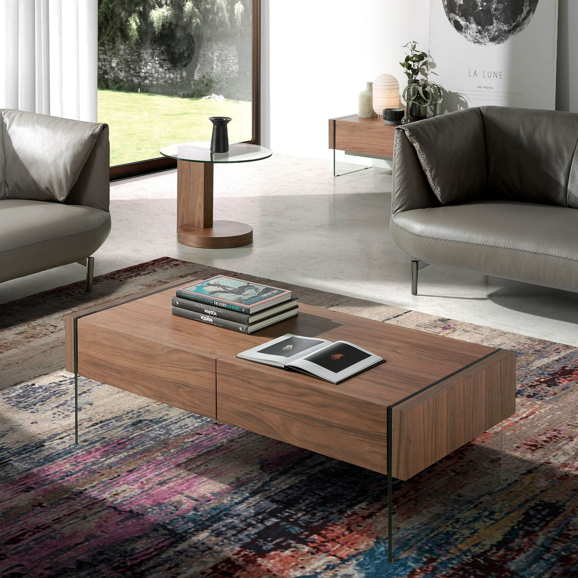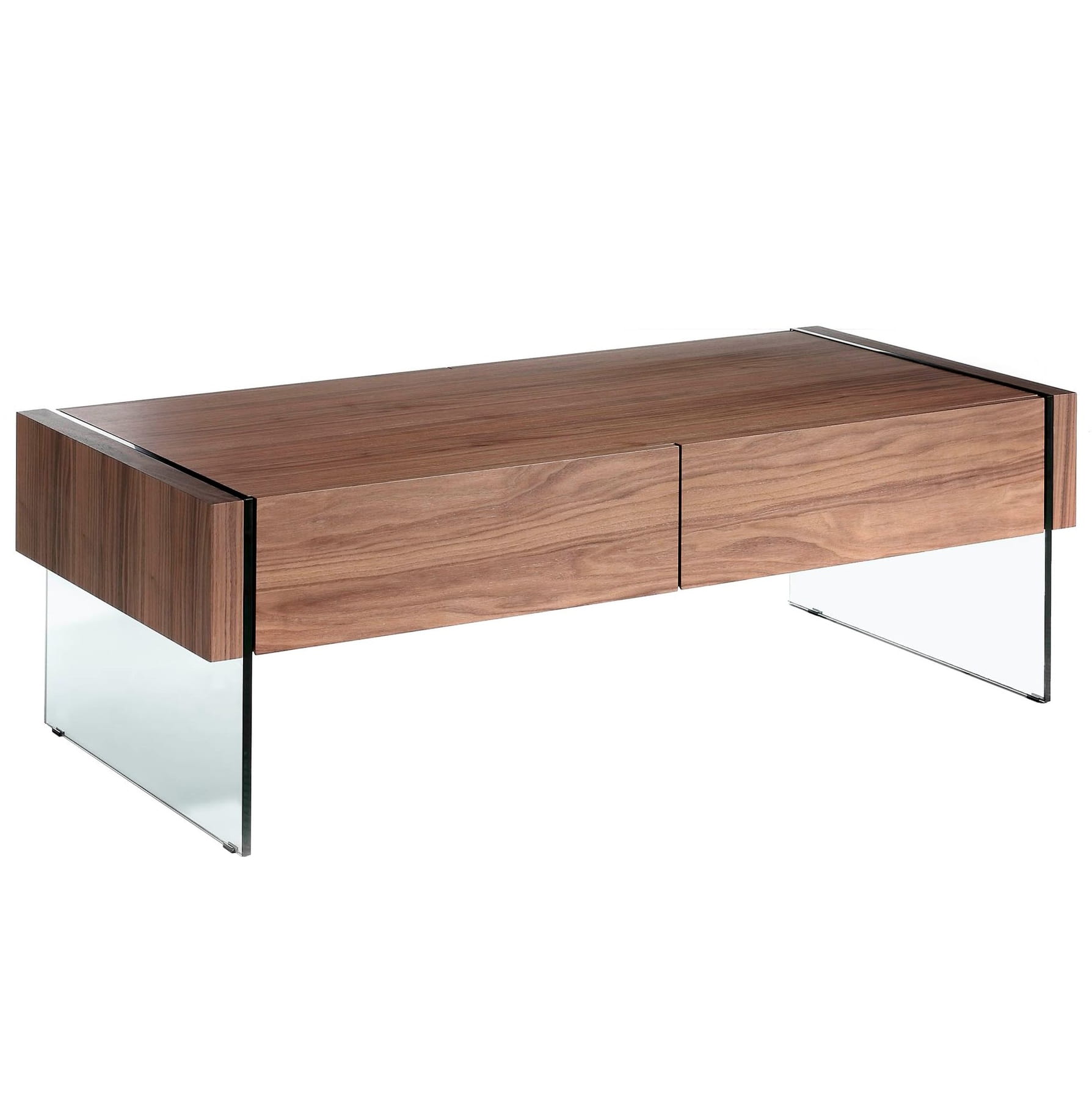 Prostokątny stolik kawowy o nowoczesnym designie wykonany z naturalnego drewna fornirowanego orzechem. Jego konstrukcja z nogami ze szkła hartowanego zapewnia