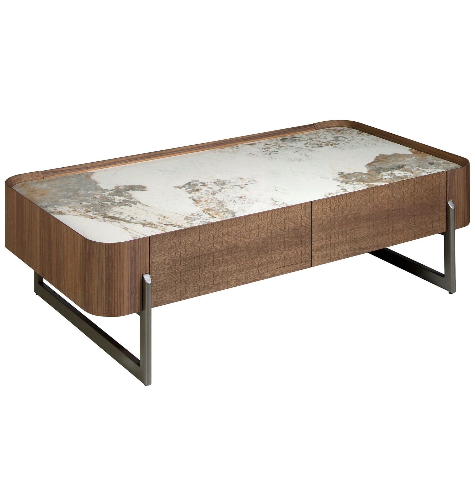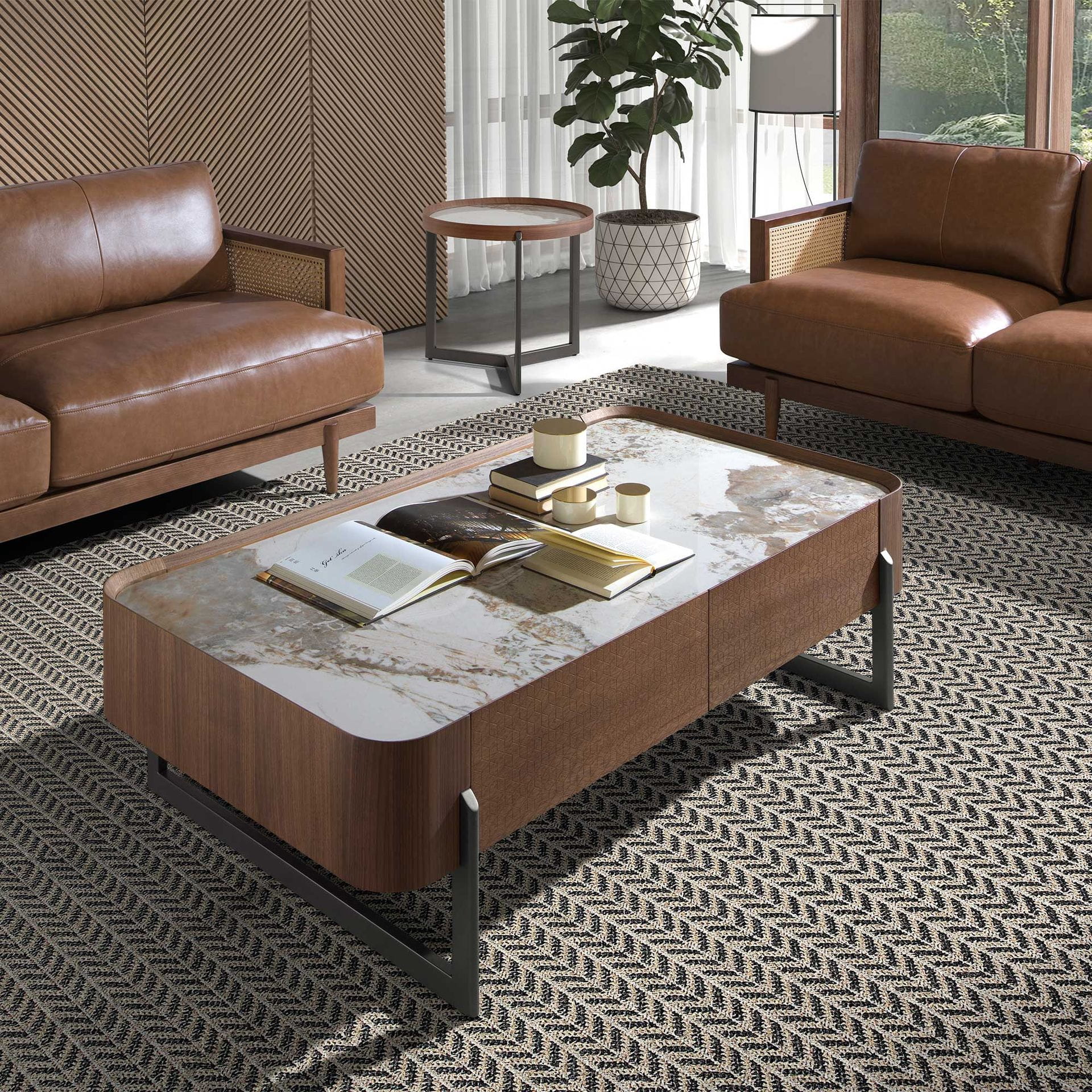 Prostokątny stolik kawowy o nowoczesnym designie wykonany z drewna fornirowanego naturalnym orzechem z eleganckim blatem z białego porcelanowego marmuru