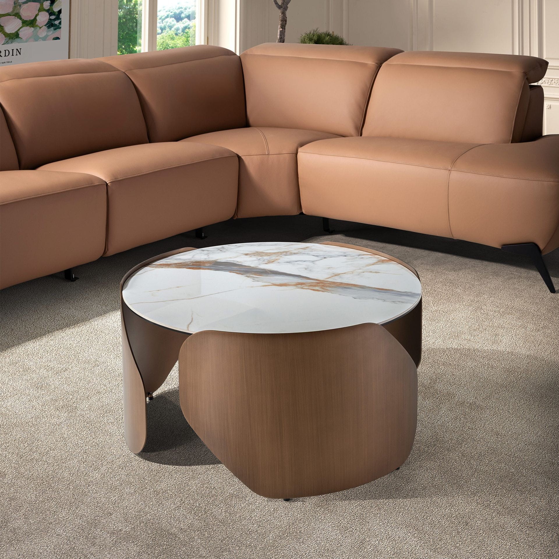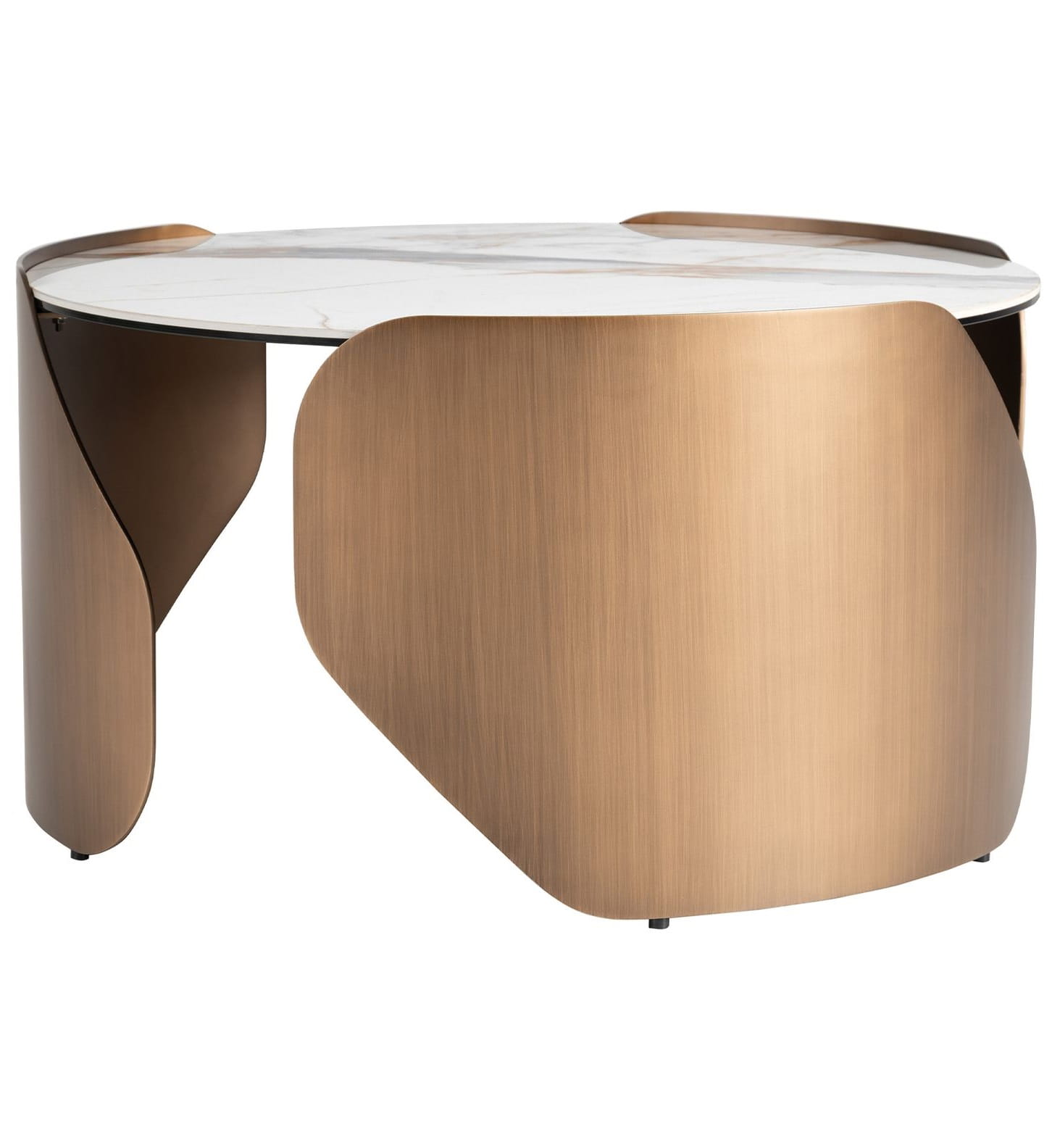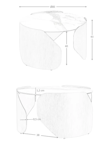 Blat z porcelany imitującej marmur zachwyca elegancją i subtelną grą żyłkowania, które przywodzą na myśl naturalne kamienne powierzchnie. Jasna, delikatnie połyskująca tafla nadaje meblowi lekkości, a jednocześnie oferuje wyjątkową trwałość na co dzień. Podstawa wykonana z metalu tworzy dynamiczną, płynącą formę. Zaokrąglone panele miękko oplatają przestrzeń pod blatem, układając się niczym harmonijny taniec materiału. Ciepłe, satynowe wykończenie dodaje projektowi nowoczesnego, a zarazem wyrafinowanego charakteru. Całość prezentuje się jak elegancka rzeźba użytkowa – stół, który z łatwością staje się głównym akcentem wnętrza. Łączy w sobie nowoczesną estetykę, płynność formy i funkcjonalność, wprowadzając do przestrzeni poczucie lekkości i subtelnego luksusu.
