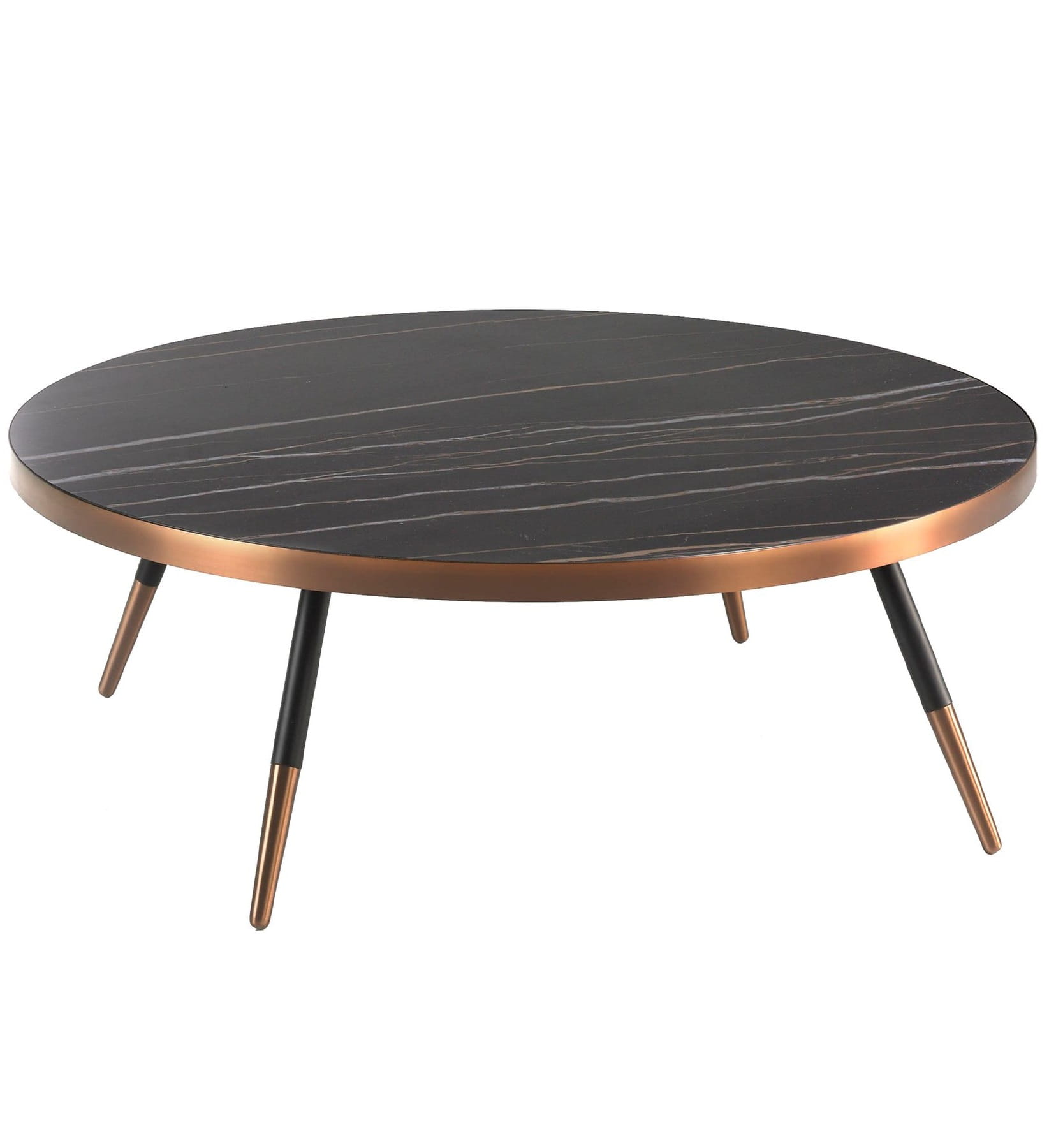 Okrągły stolik kawowy o nowoczesnym designie z blatem z czarnego porcelanowego marmuru z brązowymi żyłkami w matowym wykończeniu i oryginalnymi nogami ze