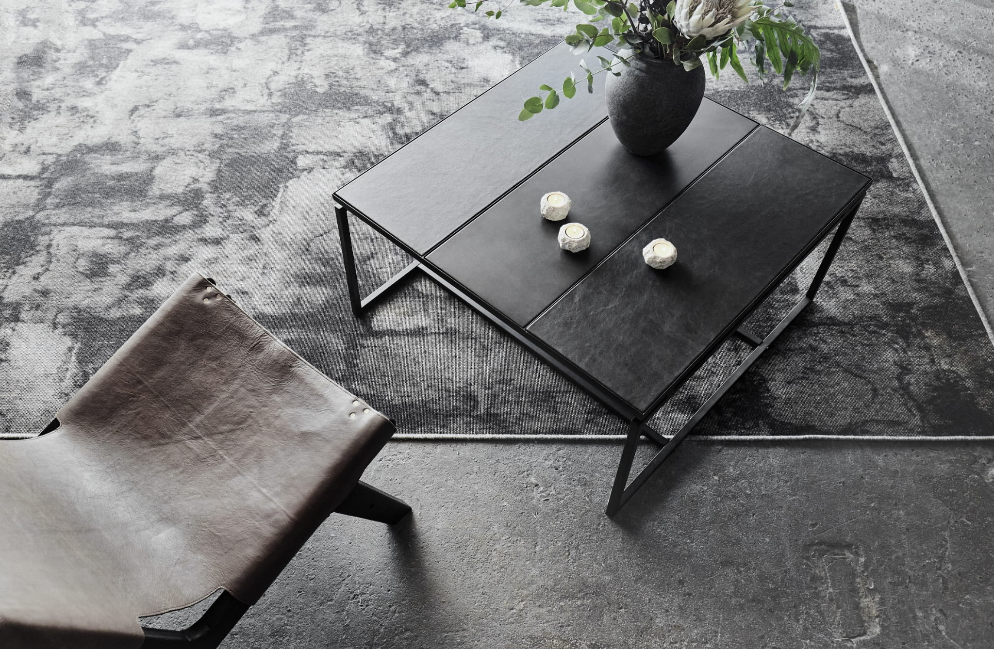 charakteryzuje się lekkim i eleganckim designem, który dodaje pomieszczeniu element rzeźbiarski. Stół wykonany jest z żeliwnej podstawy malowanej proszkowo. Blat wykonany jest z paneli z żelaza i czarnej skóry, które można ułożyć w dowolny sposób,