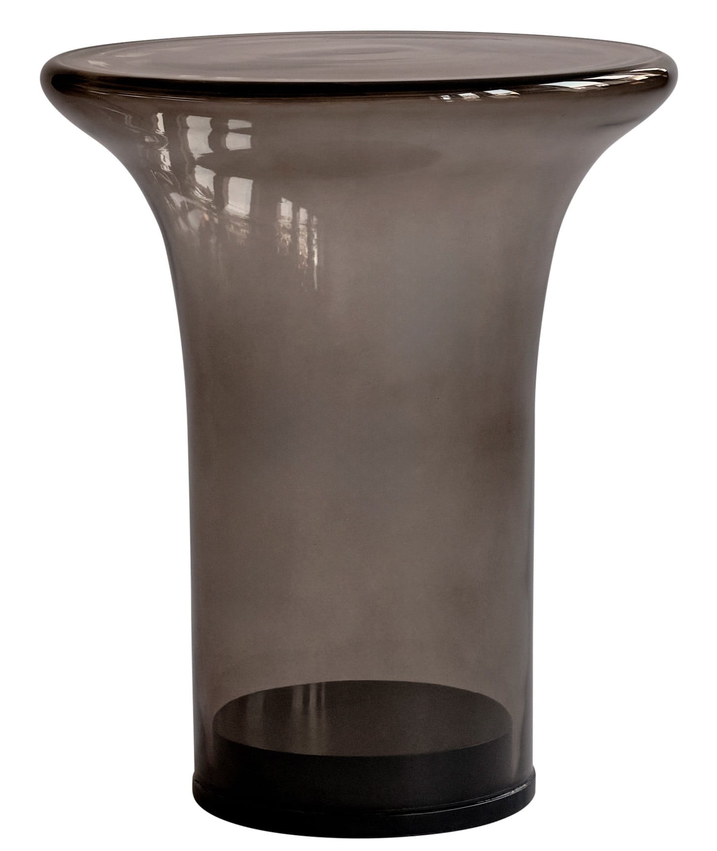 Półprzezroczysta forma unosząca się jak mgła nad leśną ściółką – Trumpet to obiekt, który balansuje pomiędzy światem materii a światłem. Jego ciemne szkło o dymnym wybarwieniu tworzy delikatny welon, przez który przebija głębia i refleks otoczenia. Blat rozszerza się subtelnie ku górze, łagodnie opadając ku brzegom niczym fale na spokojnej tafli wody. Podstawa, smukła i czysta w swojej linii, przypomina kielich rośliny, w której ukryto światło i cień. W całej tej strukturze czuć rytm natury – niespieszny, organiczny, miękki. To stół, który nie tylko dopełnia przestrzeń – on ją redefiniuje. Wprowadza nutę tajemnicy, wyrafinowania i lekkości. Doskonale odnajdzie się tam, gdzie liczy się nie tylko funkcja, ale i nastrojowość.