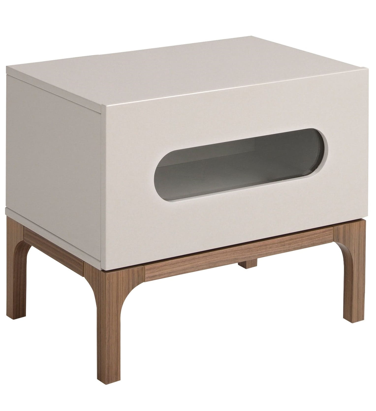 Ten stolik nocny przywodzi na myśl drobną szkatułkę w jasnym odcieniu, w której kryje się skrawek snów i subtelnych wspomnień. Owalne wycięcie na froncie