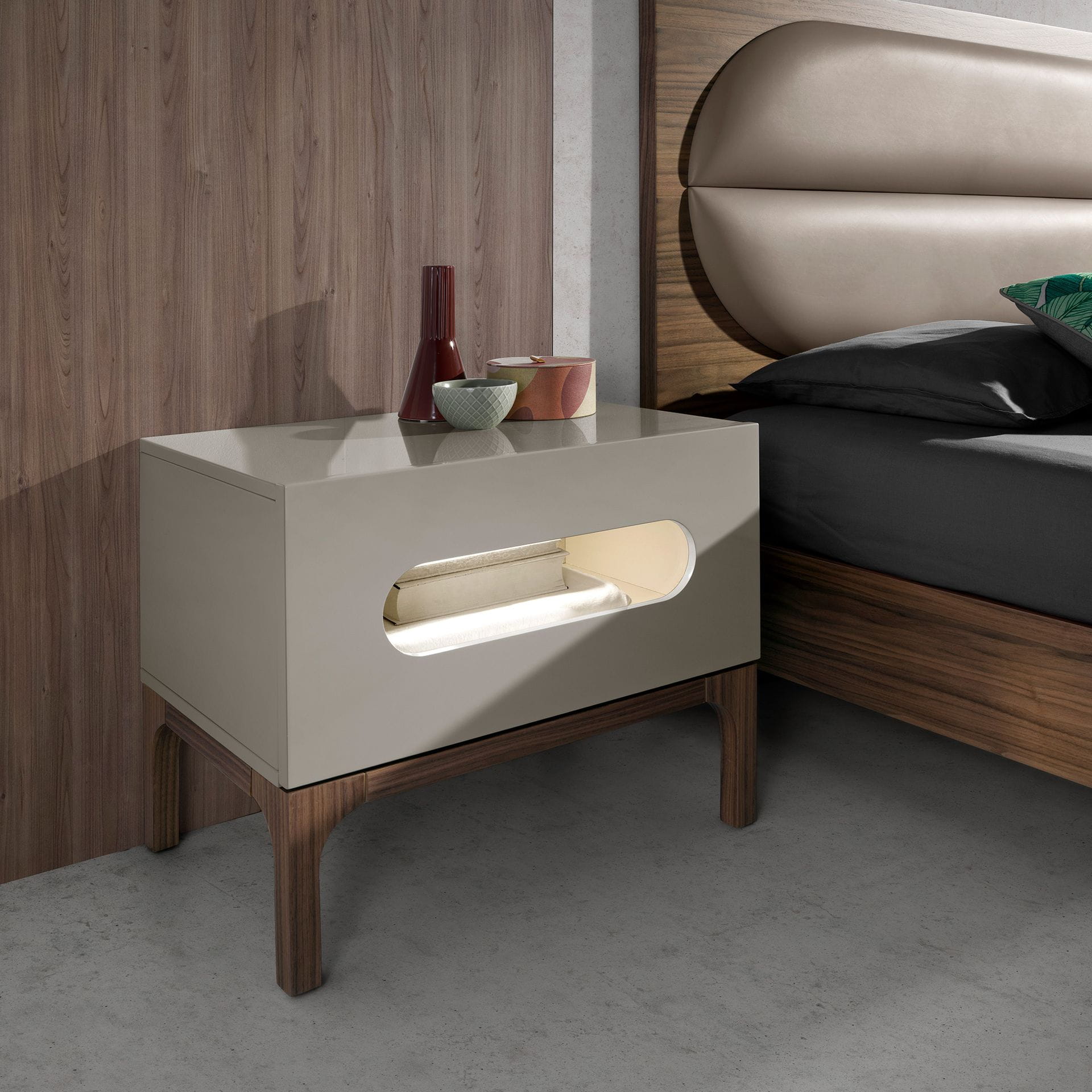 wygiętych krawędziach podkreśla lekkość bryły, dodając kompozycji ciepła i przytulności. W efekcie powstaje mebel, który nie tylko wprowadza do sypialni nutę