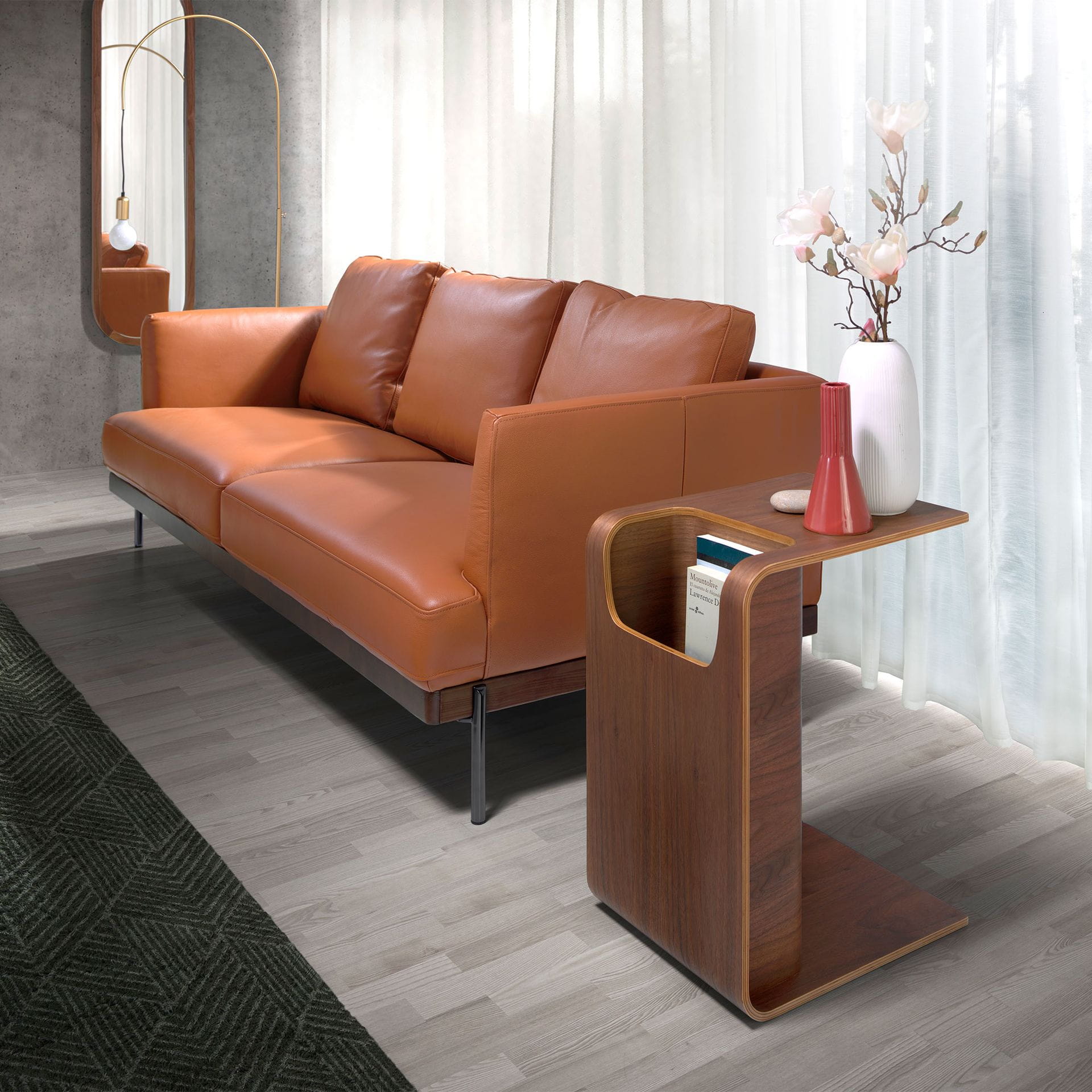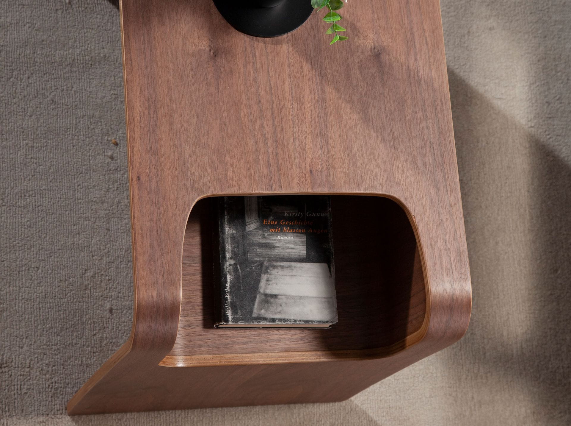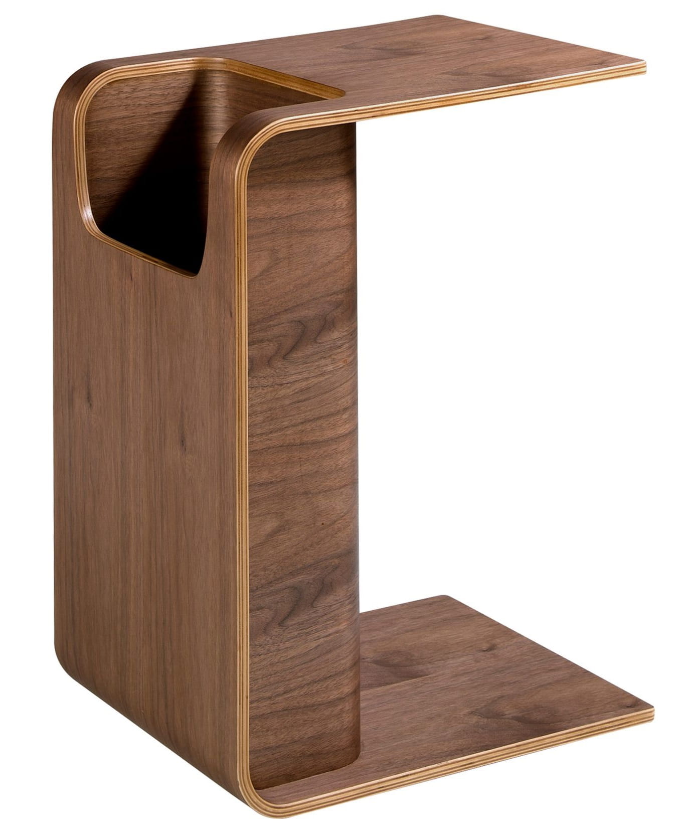 Nowoczesny stolik pomocniczy wykonany z naturalnego drewna fornirowanego orzechem. Stolik o prostym, ale oryginalnym designie, który doda niepowtarzalnego