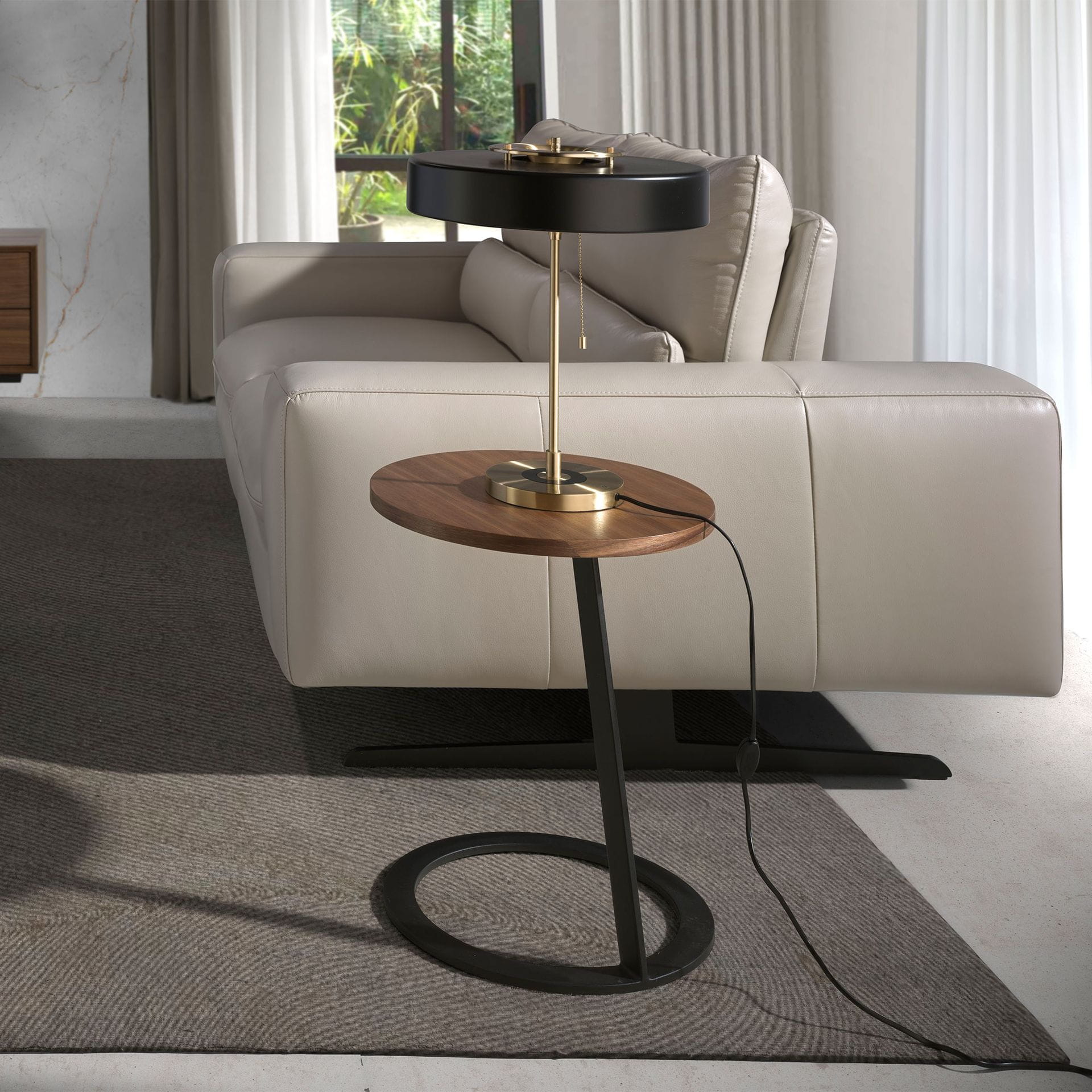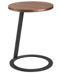 Okrągły stolik boczny o nowoczesnym designie z blatem z drewna fornirowanego naturalnym orzechem i nogami ze stali nierdzewnej malowanymi farbą epoksydową na