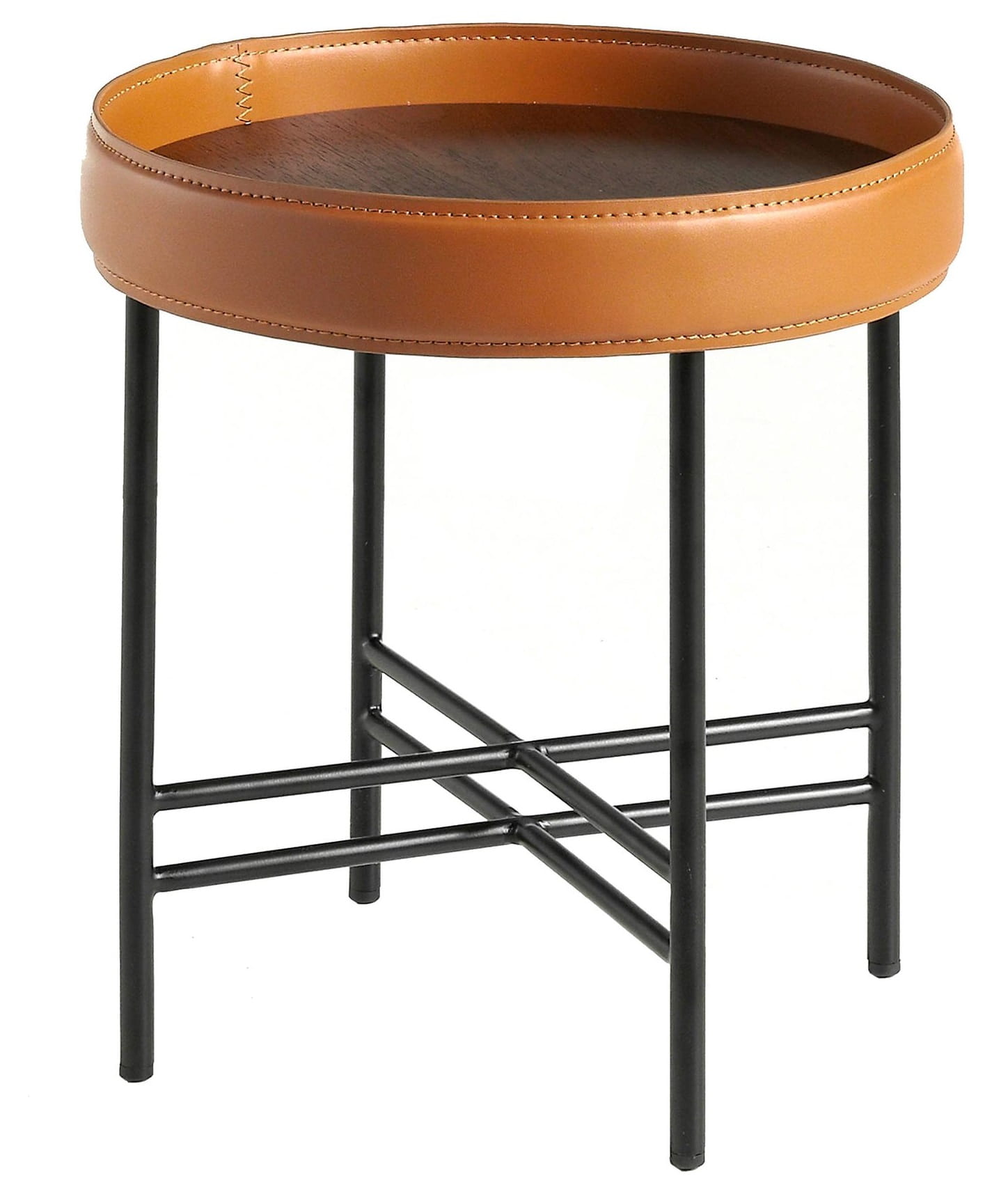 Okrągły stolik pomocniczy o nowoczesnym designie z blatem z drewna fornirowanego naturalnym orzechem i oryginalnymi nogami ze stali nierdzewnej malowanymi farbą