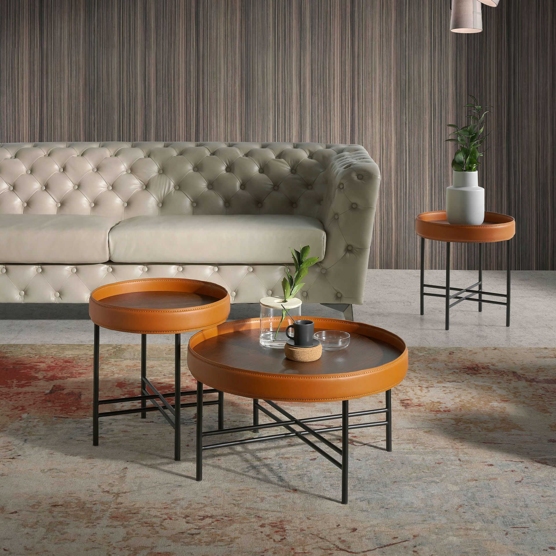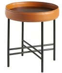 epoksydową na czarno, w połączeniu z elegancką tapicerką z ekologicznej skóry w kolorze pomarańczowym. Stolik o prostym, ale oryginalnym designie, który doda