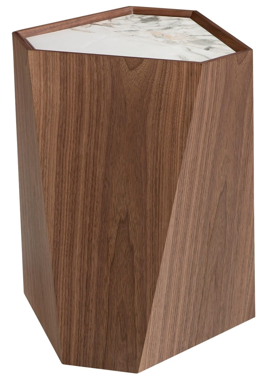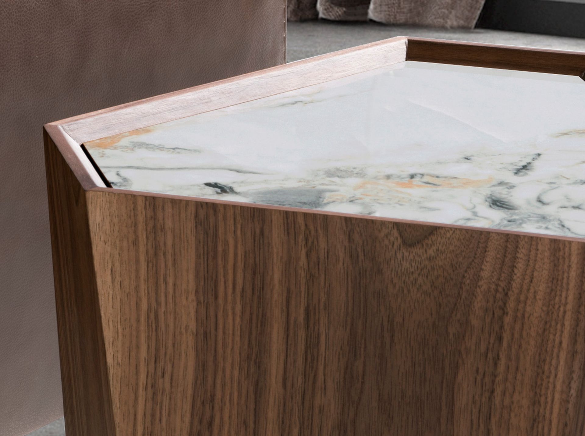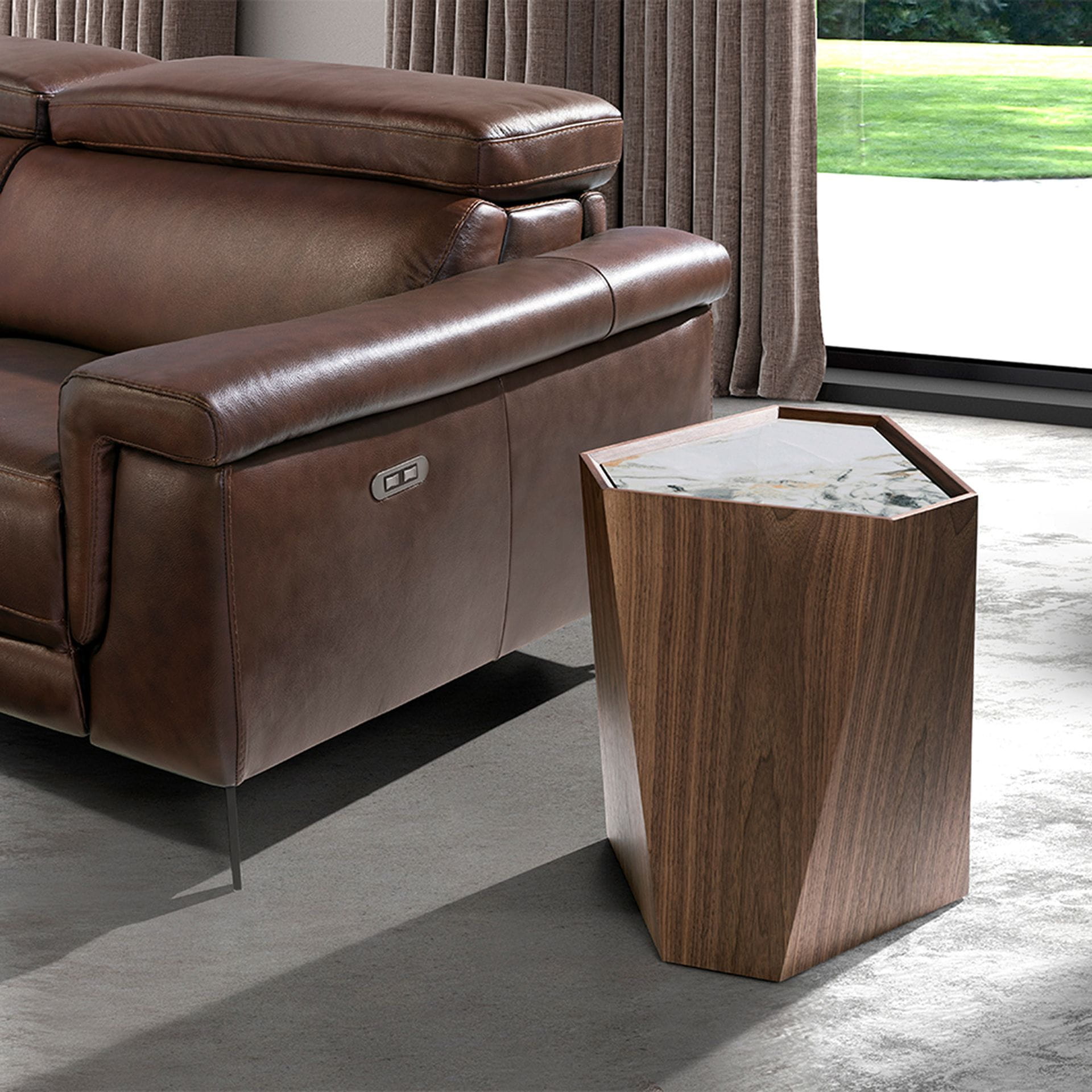 marmuru dodaje jej subtelnej elegancji. Gra kątów i płaszczyzn sprawia, że ten stolik boczny jest czymś więcej niż tylko meblem – staje się nowoczesną rzeźbą, w której