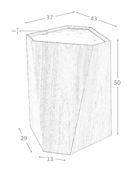 Geometria natury zamknięta w minimalistycznej formie. Drewniana bryła o dynamicznych cięciach przyciąga wzrok swoją architektoniczną siłą, a blat z porcelanowego