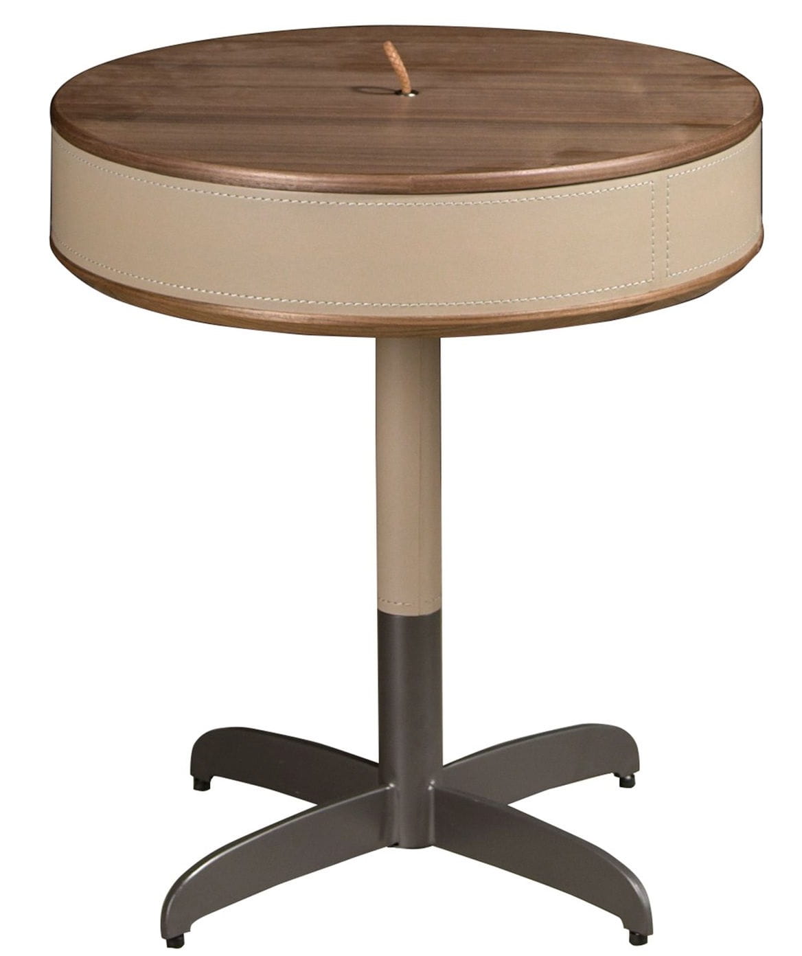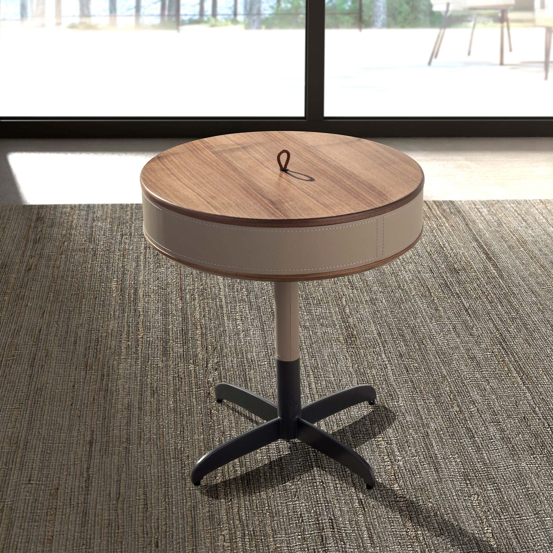 Stolik pomocniczy marki Angel Cerdá to wyrafinowane połączenie funkcjonalności i stylu inspirowanego elegancją modernizmu. Okrągły blat z naturalnego drewna orzechowego emanuje ciepłem i klasą, a jego rant obszyty skórą w odcieniu beżu dodaje przedmiotowi miękkości i rzemieślniczego charakteru. Na środku blatu subtelna, skórzana zawieszka stanowi zarówno detal ozdobny, jak i praktyczny uchwyt do otwierania ukrytego schowka. Smukła noga, częściowo pokryta skórą i osadzona na metalowej podstawie w kształcie krzyża, nadaje całości industrialnego sznytu, zachowując przy tym elegancką lekkość formy. Mebel ten, choć kompaktowy, odznacza się dużą obecnością estetyczną – sprawdzi się zarówno jako stolik boczny przy sofie, jak i samodzielny akcent w nowoczesnym salonie czy holu. To wyraz świadomego wzornictwa, gdzie każdy materiał i detal służy równocześnie funkcji i formie.