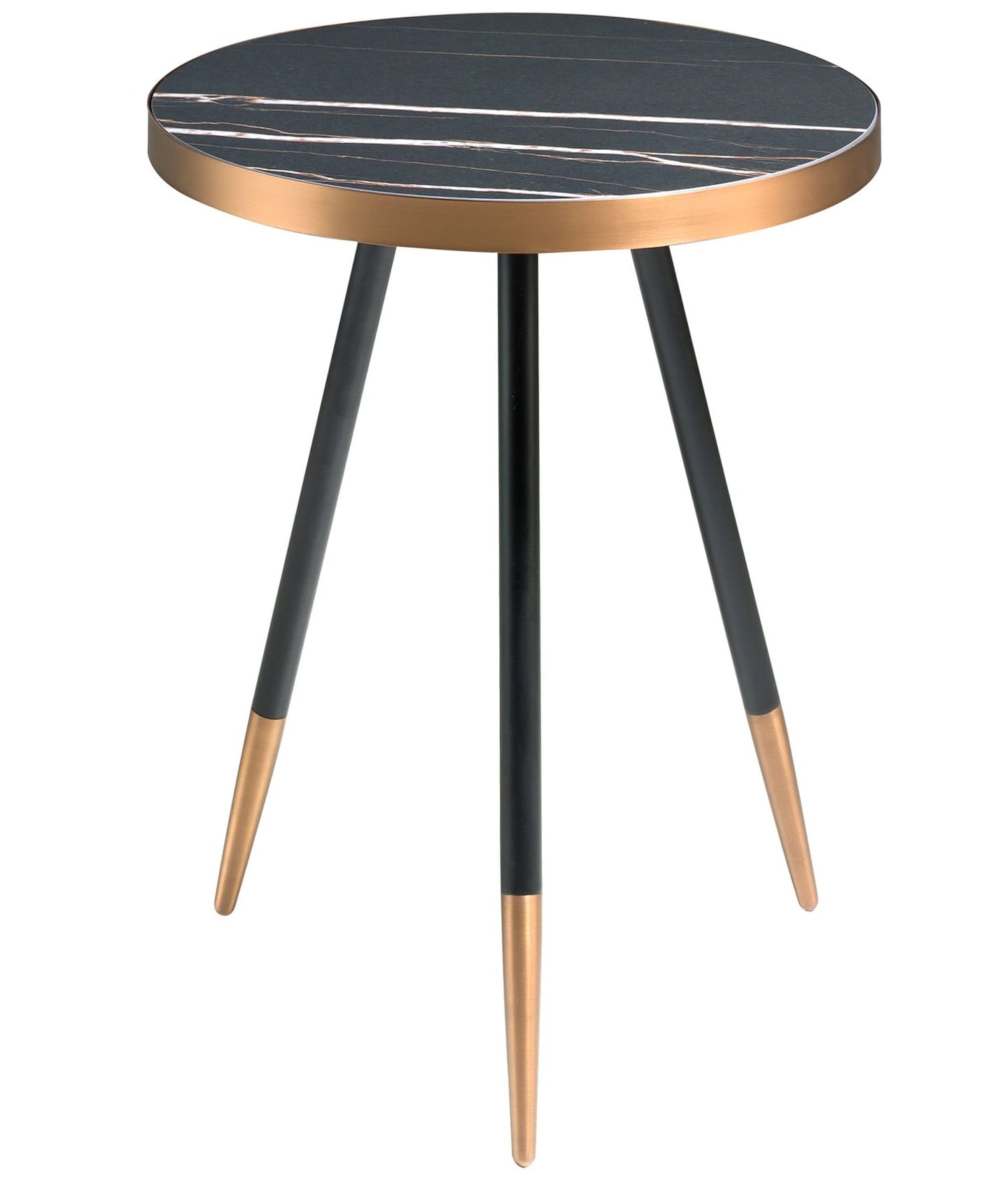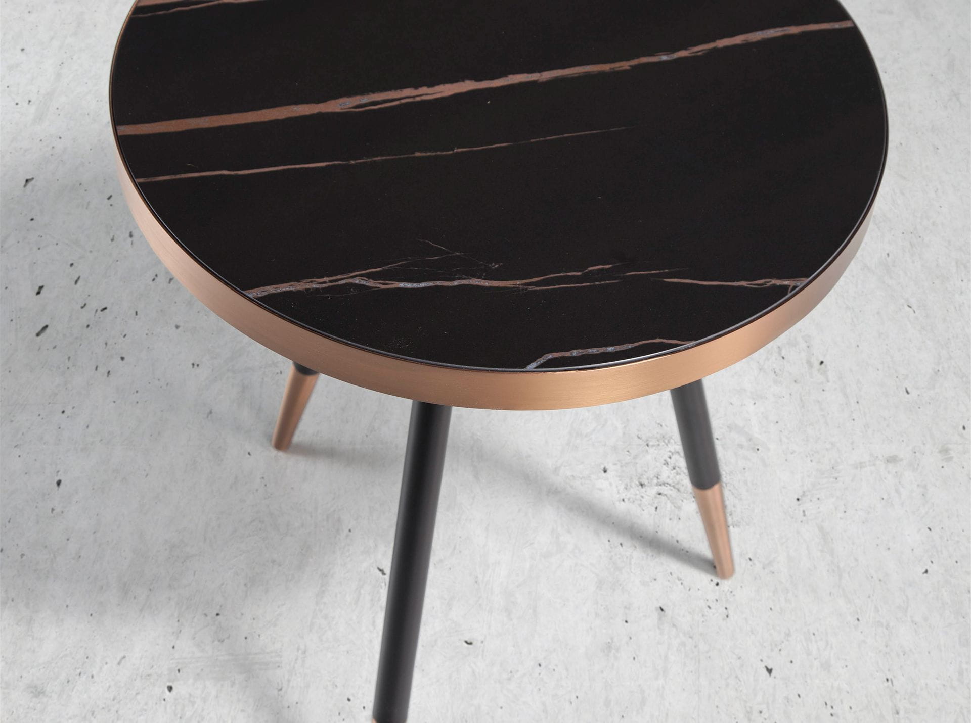 Okrągły stolik pomocniczy o nowoczesnym designie z blatem z czarnego porcelanowego marmuru z brązowymi żyłkami w matowym wykończeniu i oryginalnymi nogami ze