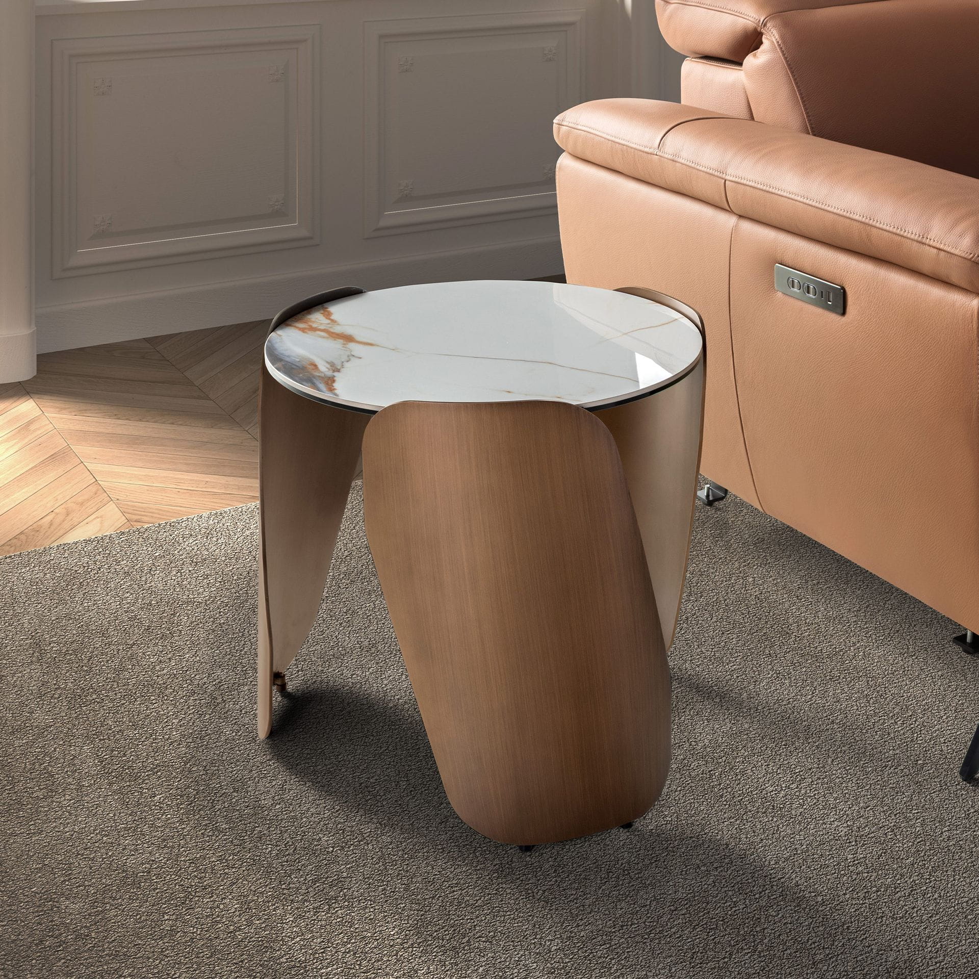 Blat z porcelany imitującej marmur zachwyca elegancją i subtelną grą żyłkowania, które przywodzą na myśl naturalne kamienne powierzchnie. Jasna, delikatnie połyskująca tafla nadaje meblowi lekkości, a jednocześnie oferuje wyjątkową trwałość na co dzień. Podstawa wykonana z metalu tworzy dynamiczną, płynącą formę. Zaokrąglone panele miękko oplatają przestrzeń pod blatem, układając się niczym harmonijny taniec materiału. Ciepłe, satynowe wykończenie dodaje projektowi nowoczesnego, a zarazem wyrafinowanego charakteru. Całość prezentuje się jak elegancka rzeźba użytkowa – stół, który z łatwością staje się głównym akcentem wnętrza. Łączy w sobie nowoczesną estetykę, płynność formy i funkcjonalność, wprowadzając do przestrzeni poczucie lekkości i subtelnego luksusu.