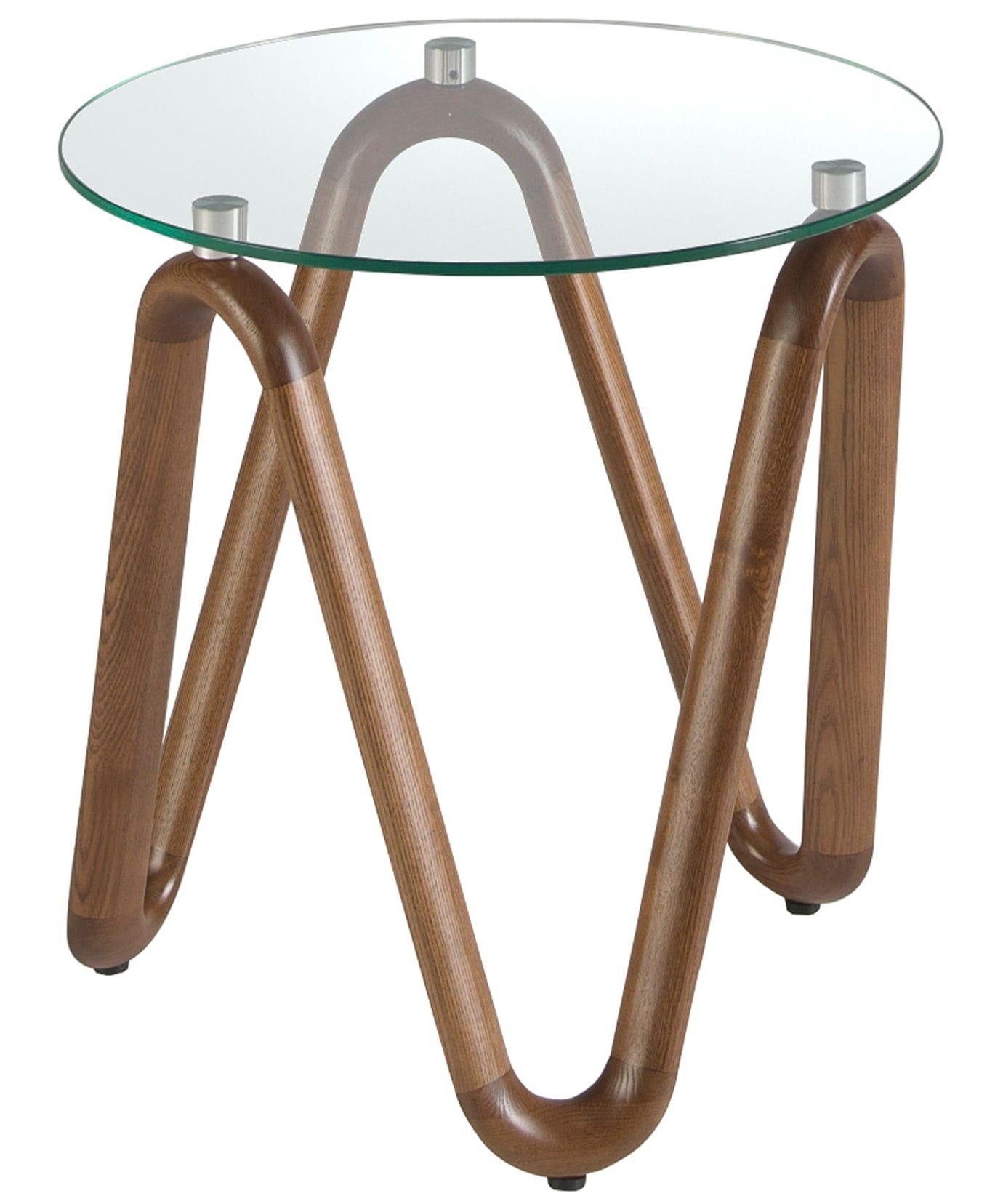 Nowoczesny stolik pomocniczy z blatem ze szkła hartowanego i oryginalną drewnianą podstawą w kolorze orzecha. Stolik o wyjątkowym i oryginalnym designie, który