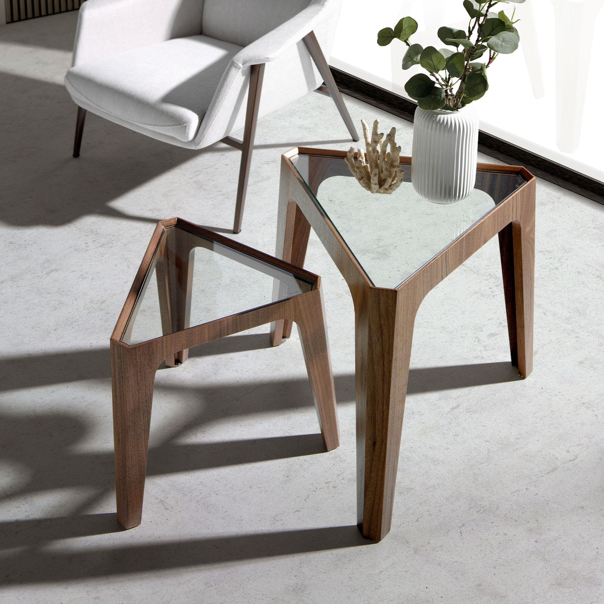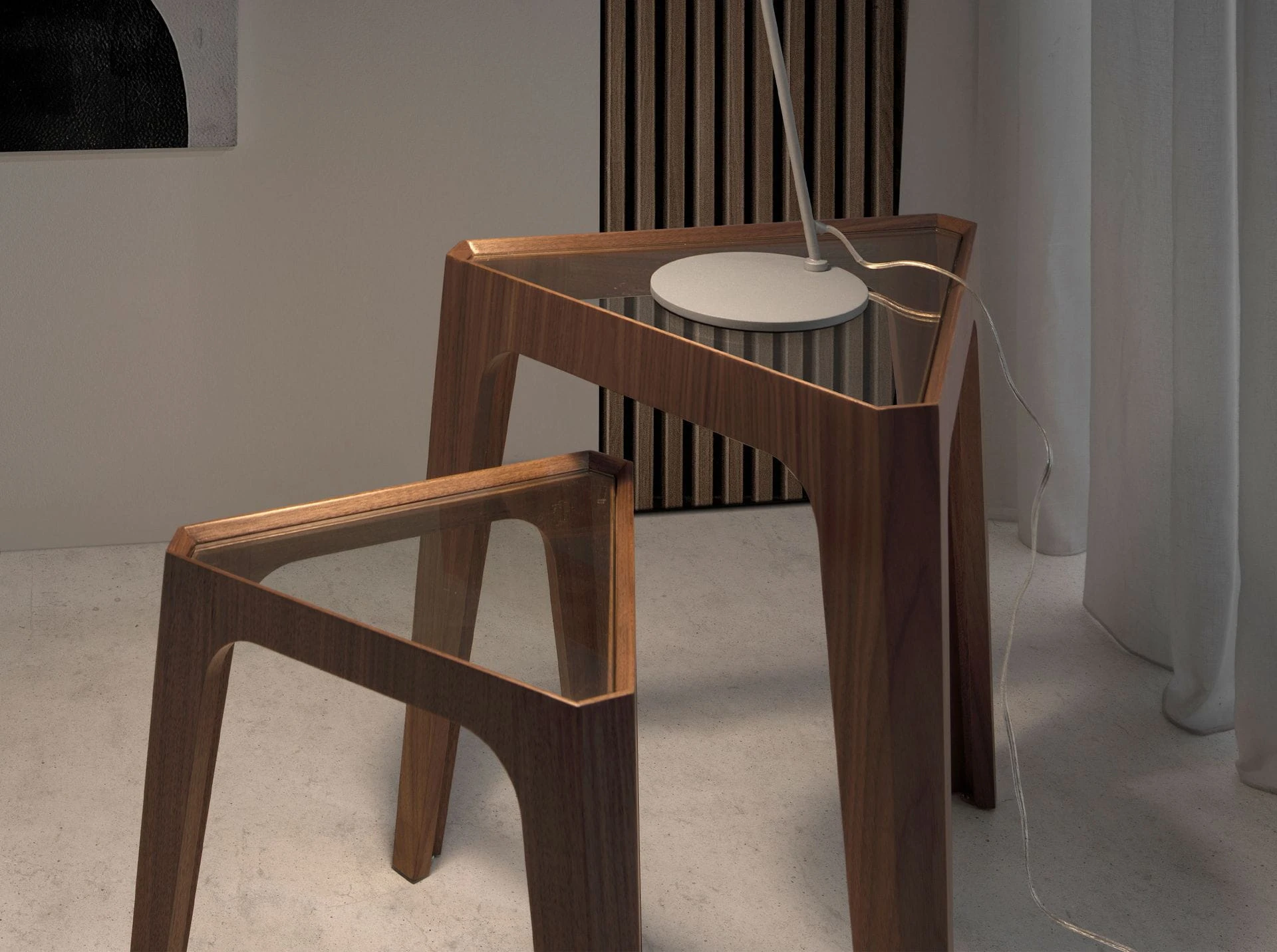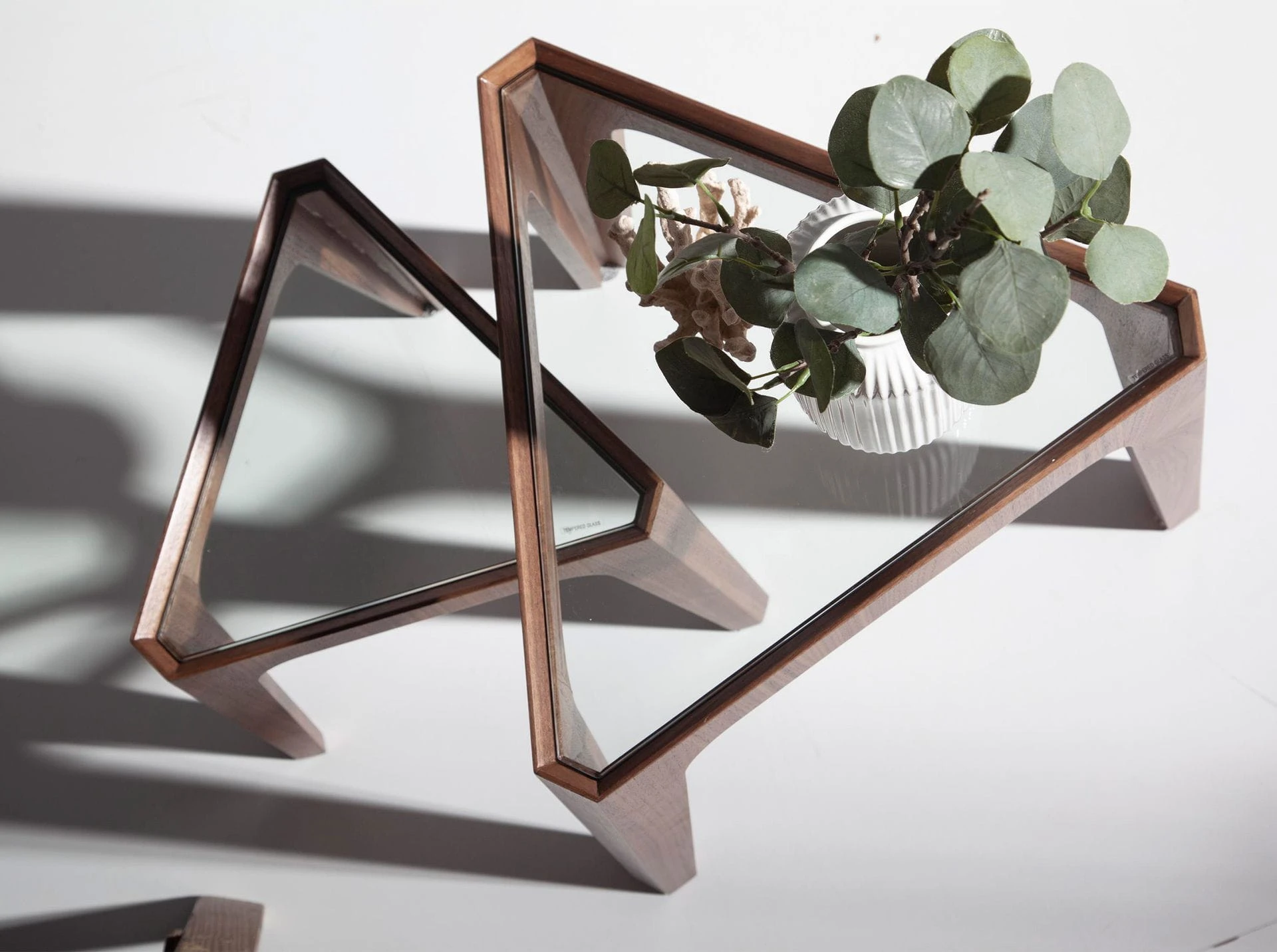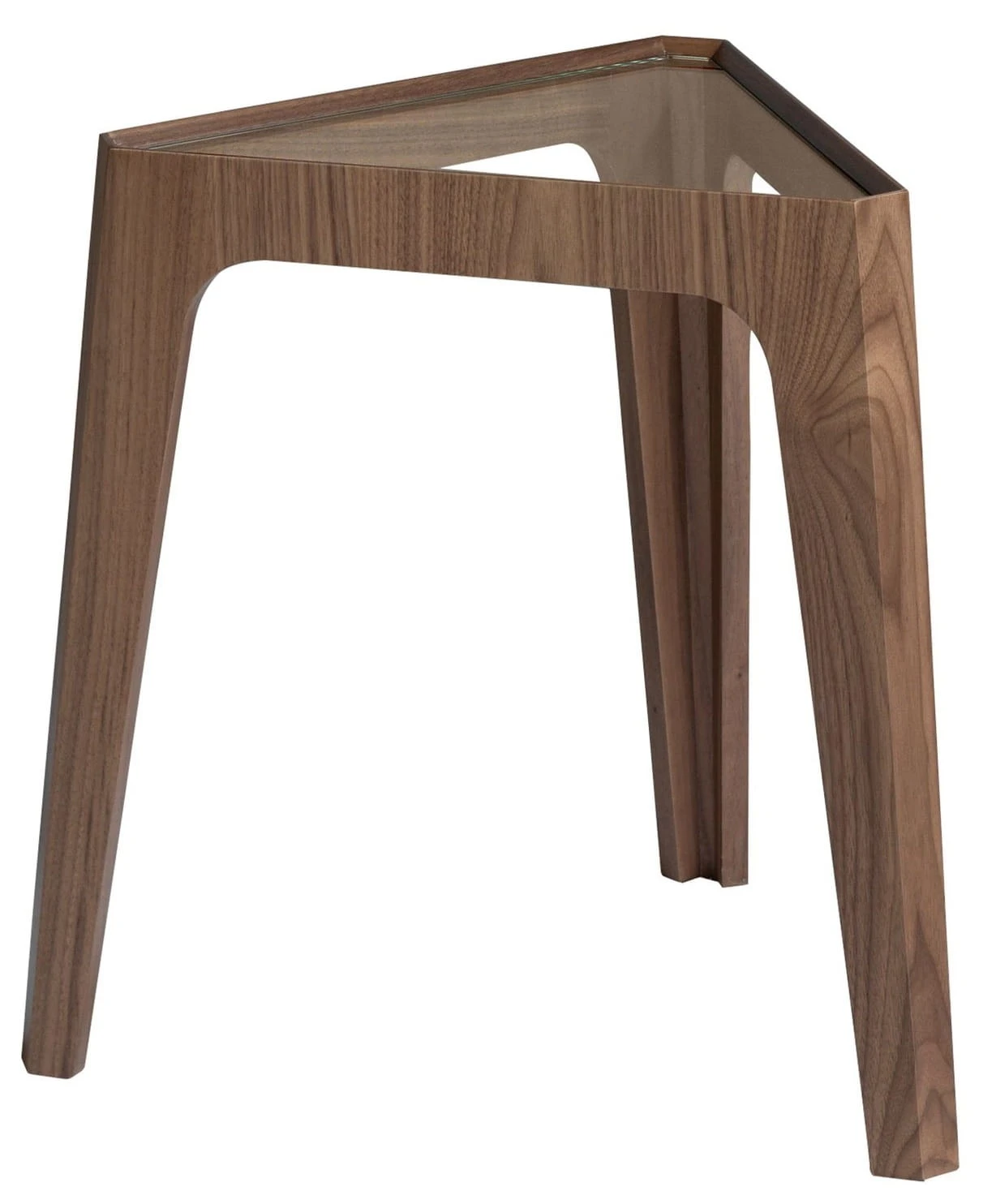 Nowoczesny stolik pomocniczy z blatem ze szkła hartowanego i oryginalną drewnianą podstawą w kolorze orzecha. Stolik o wyjątkowym i oryginalnym designie, który