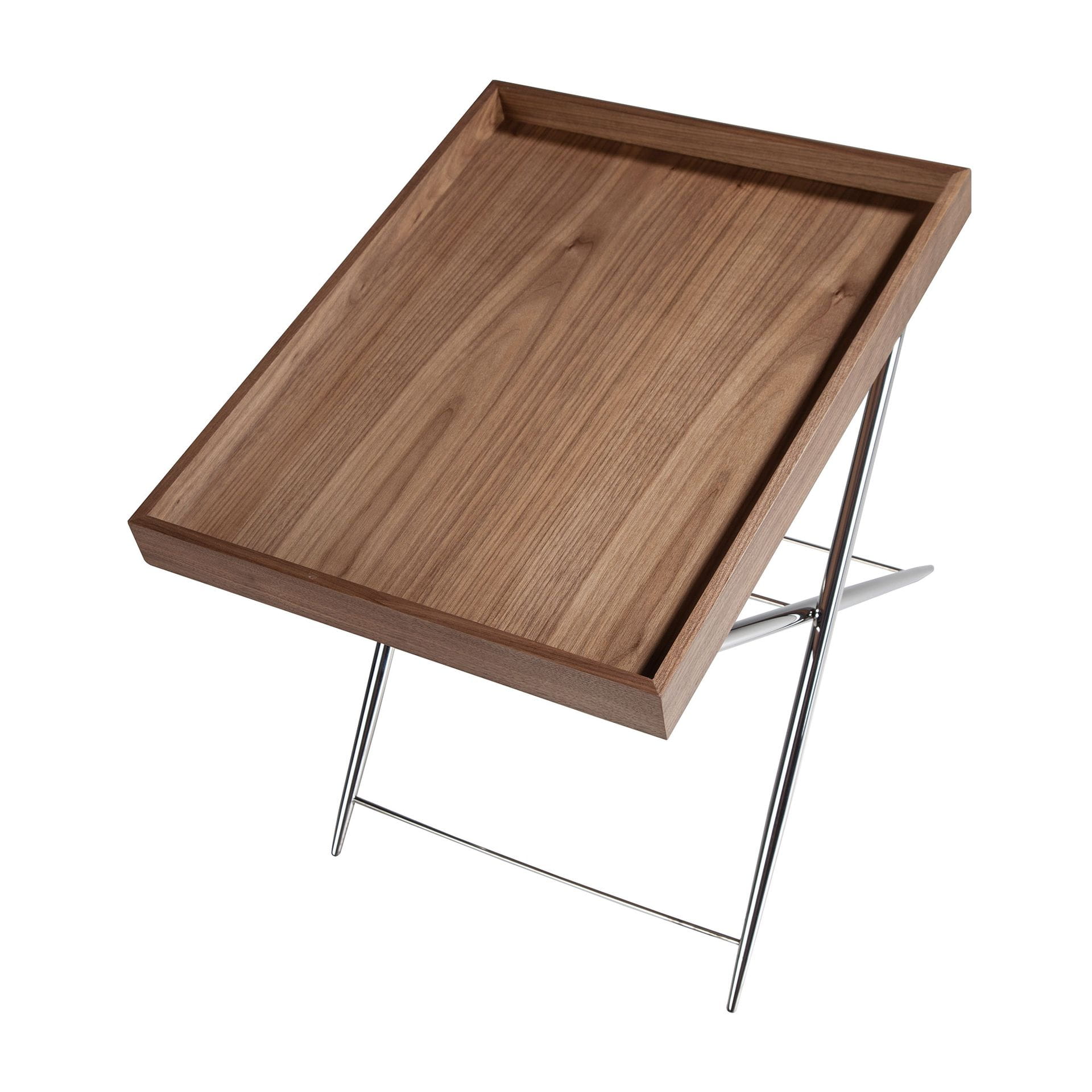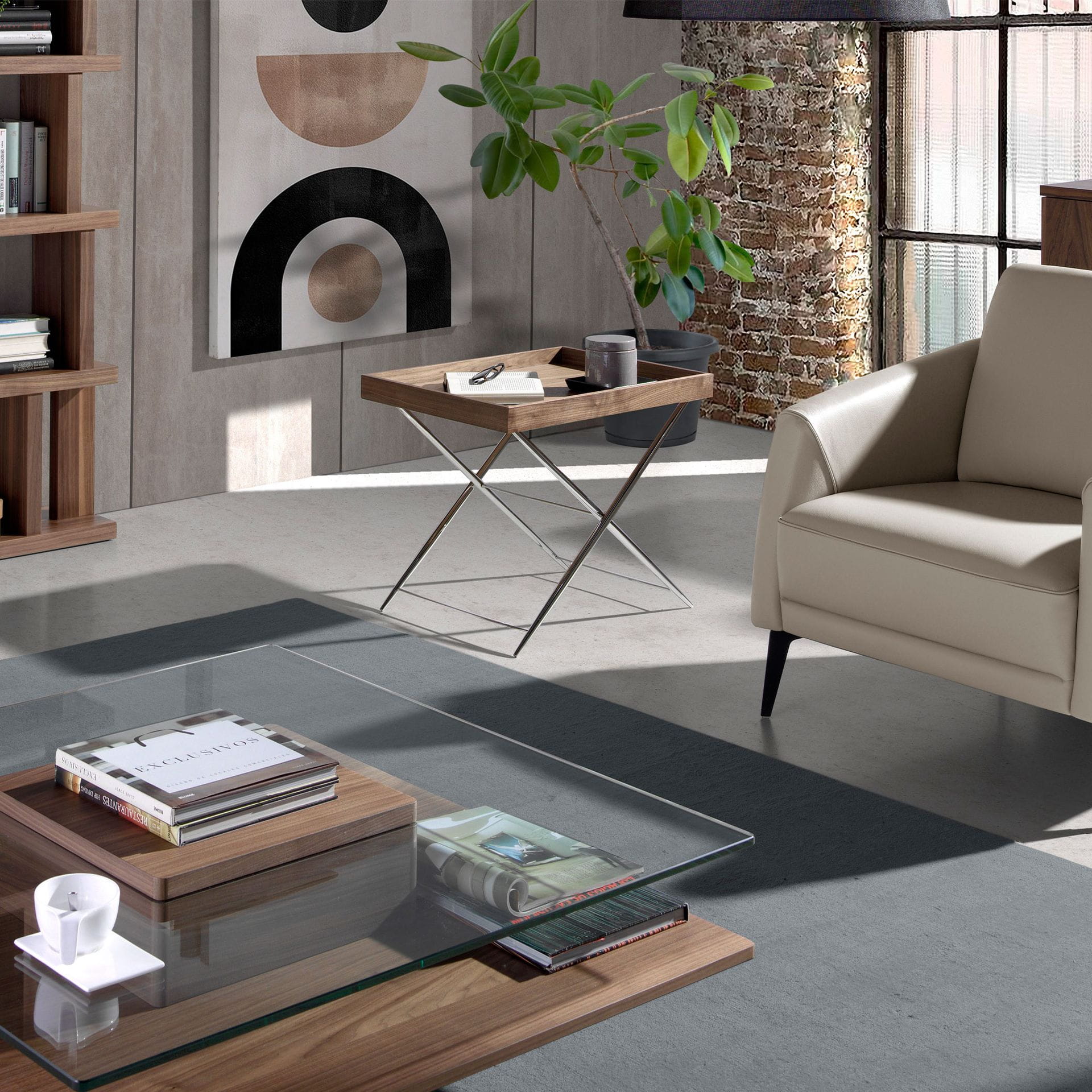 Materiał: drewno fornirowane naturalnym orzechem, stal chromowana