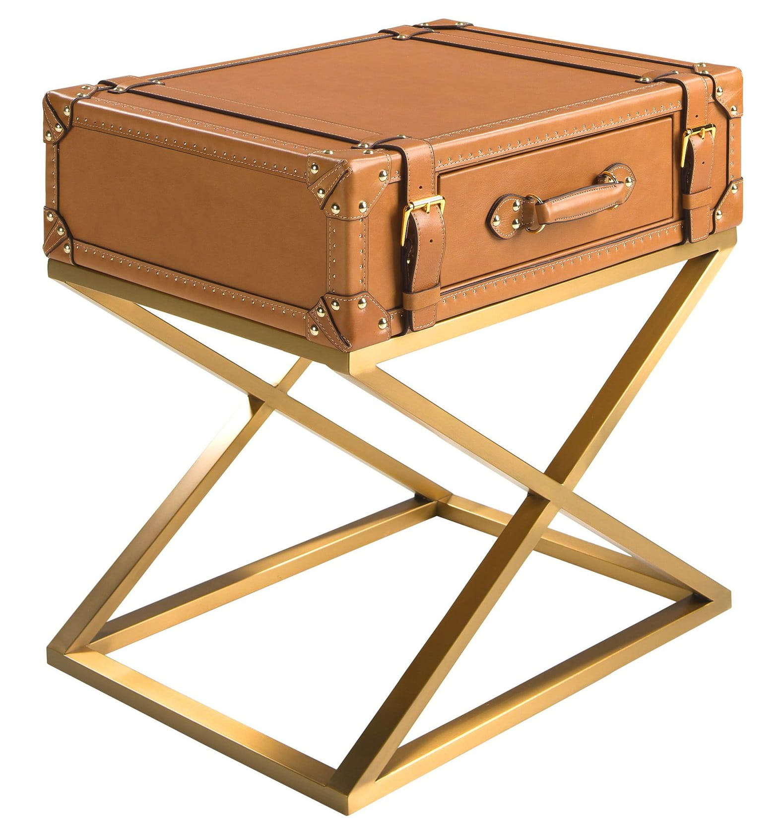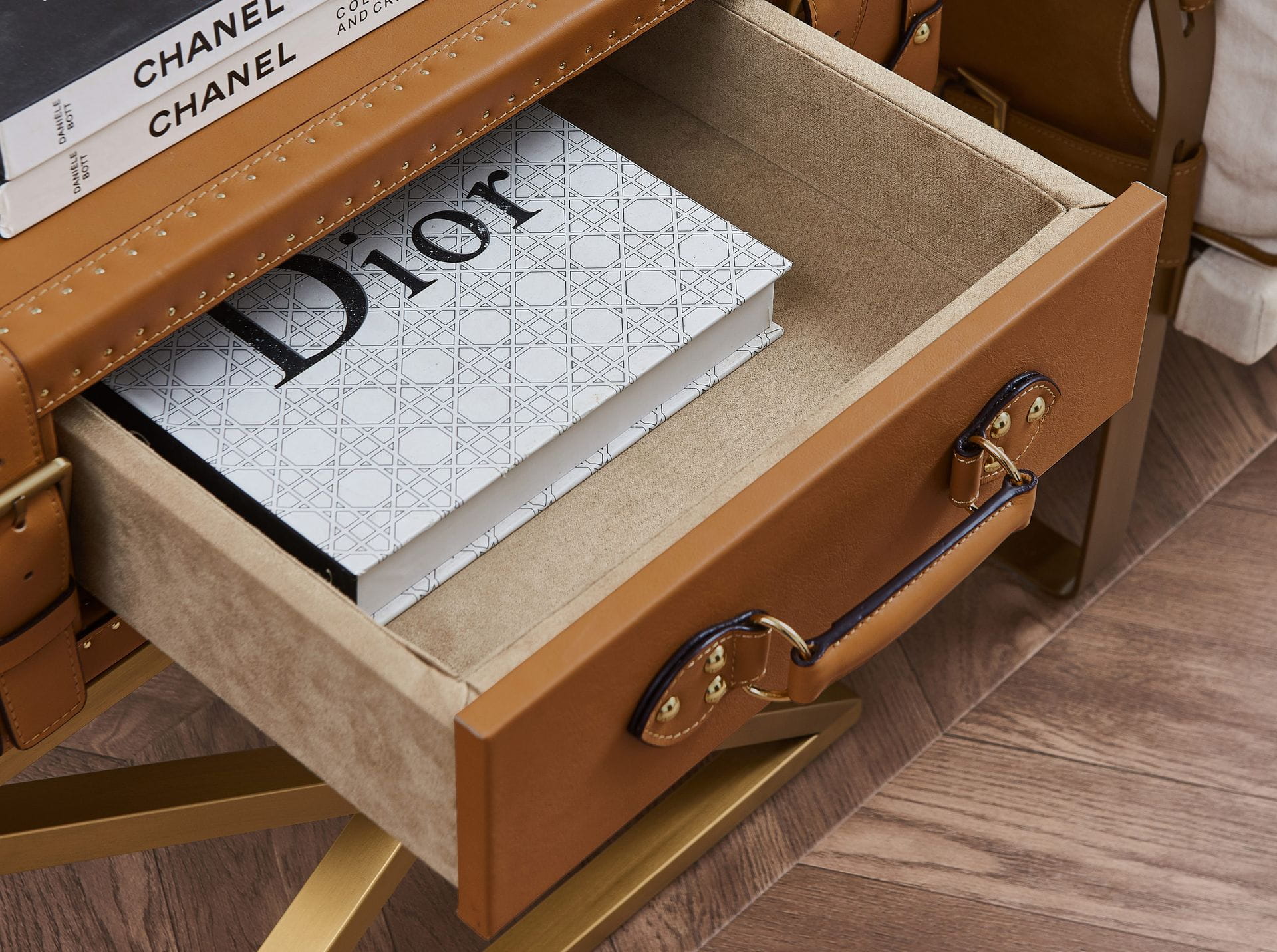 Prostokątny stolik kawowy o nowoczesnym designie wykonany ze skóry bydlęcej. Konstrukcja z nóg ze stali nierdzewnej w złotym kolorze zapewnia nutę nowoczesności