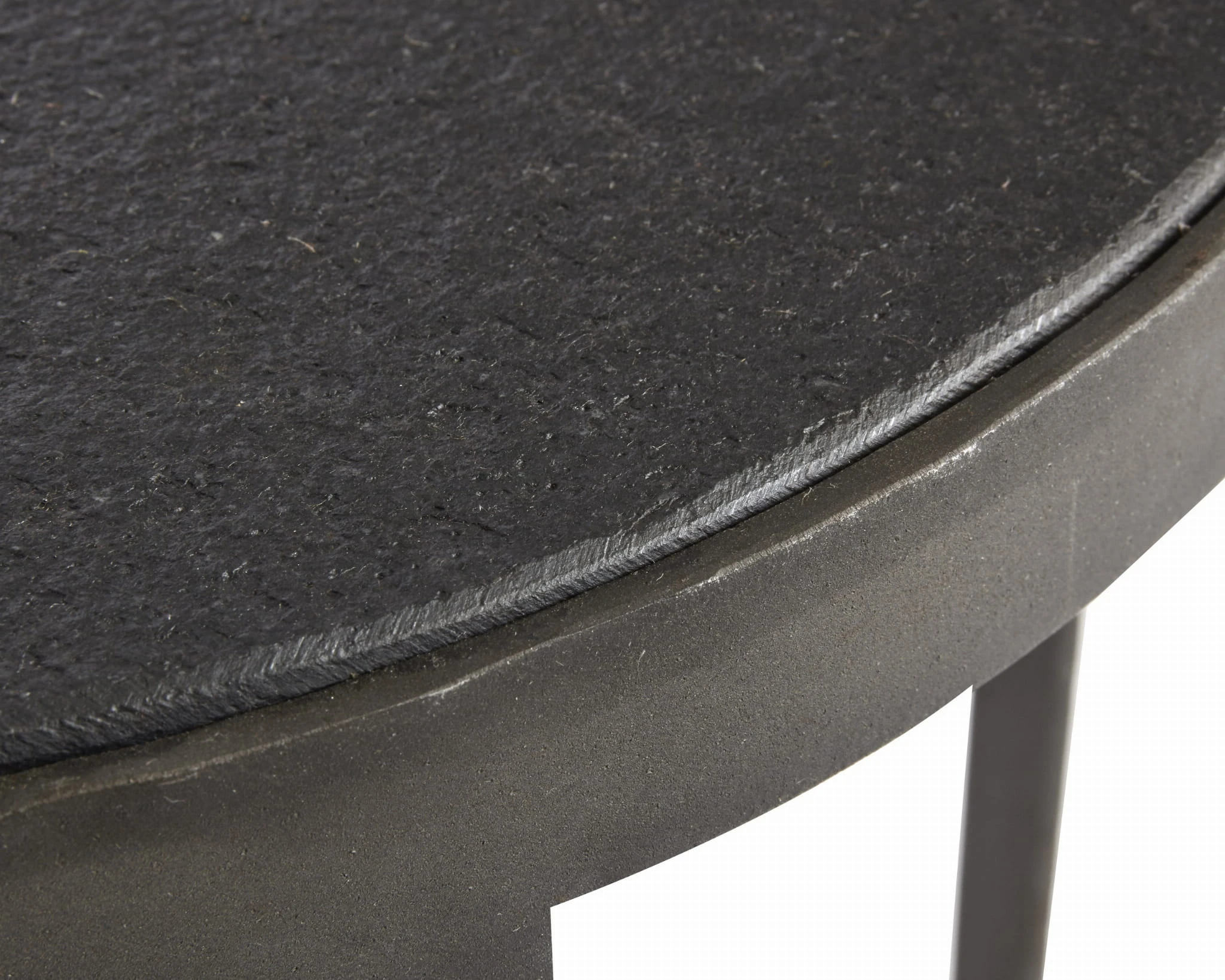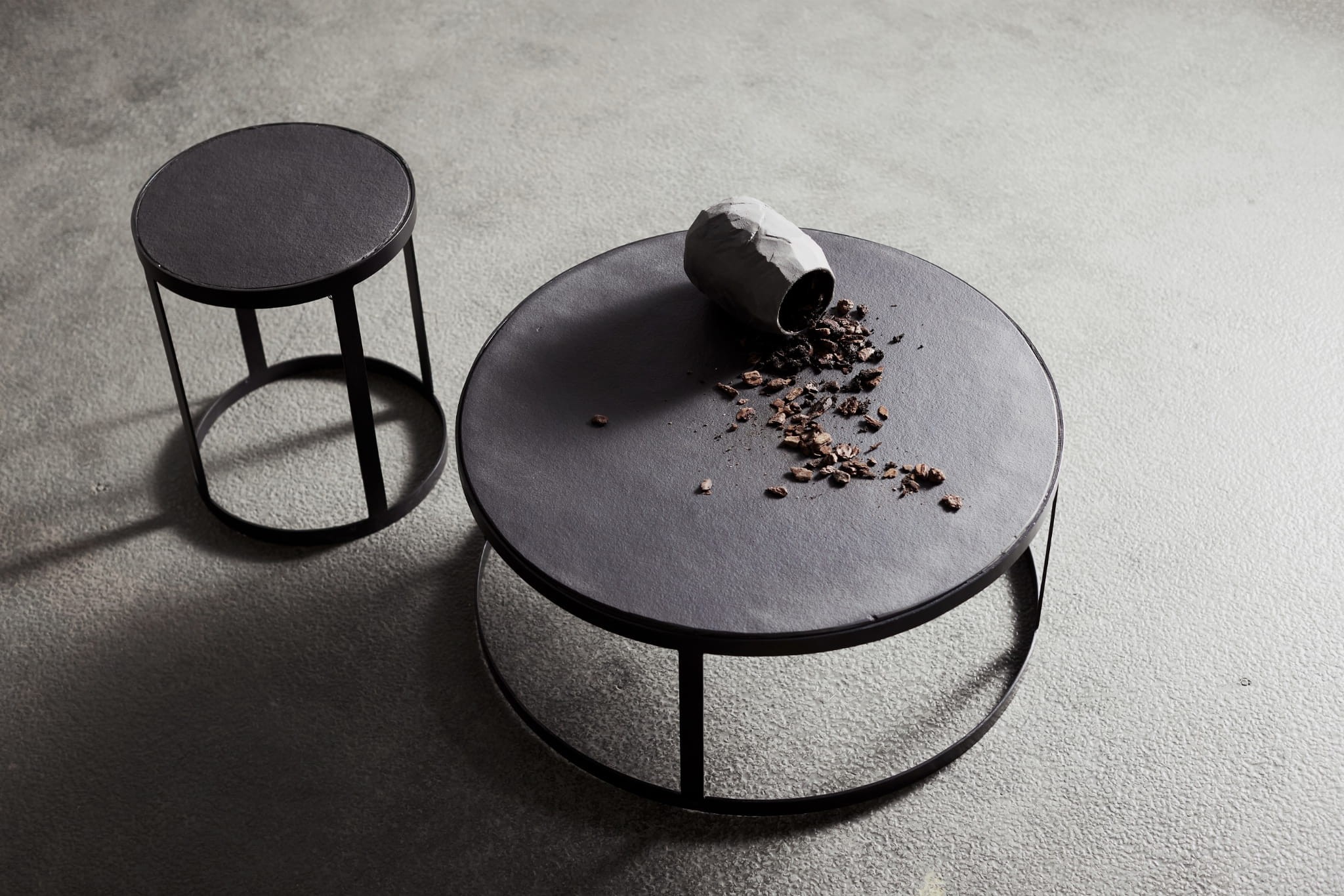 Kamienny blat jest przycięty tak, aby pasował do kształtu podstawy. Stolik jest wielofunkcyjny, może służyć również jako stolik kawowy, stolik