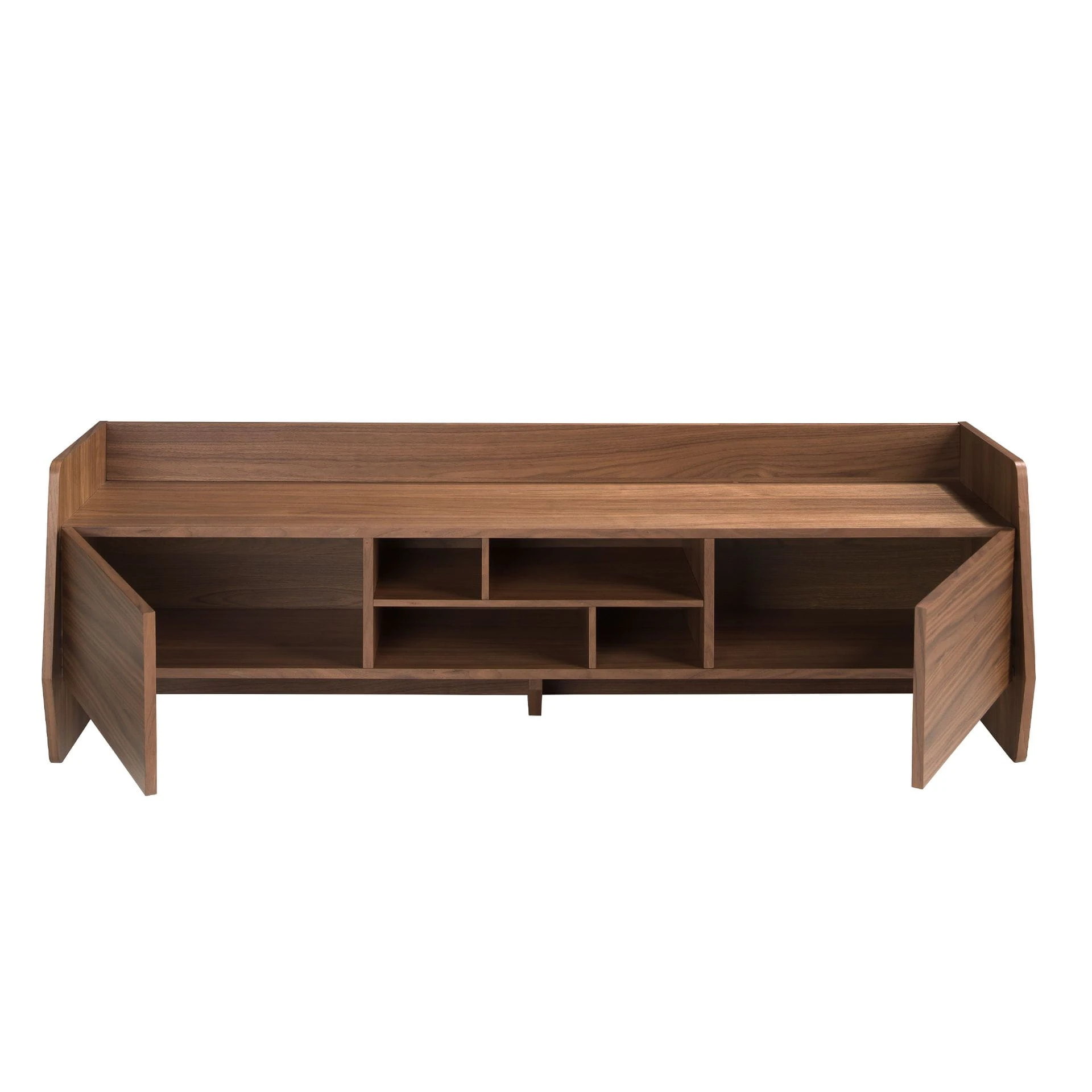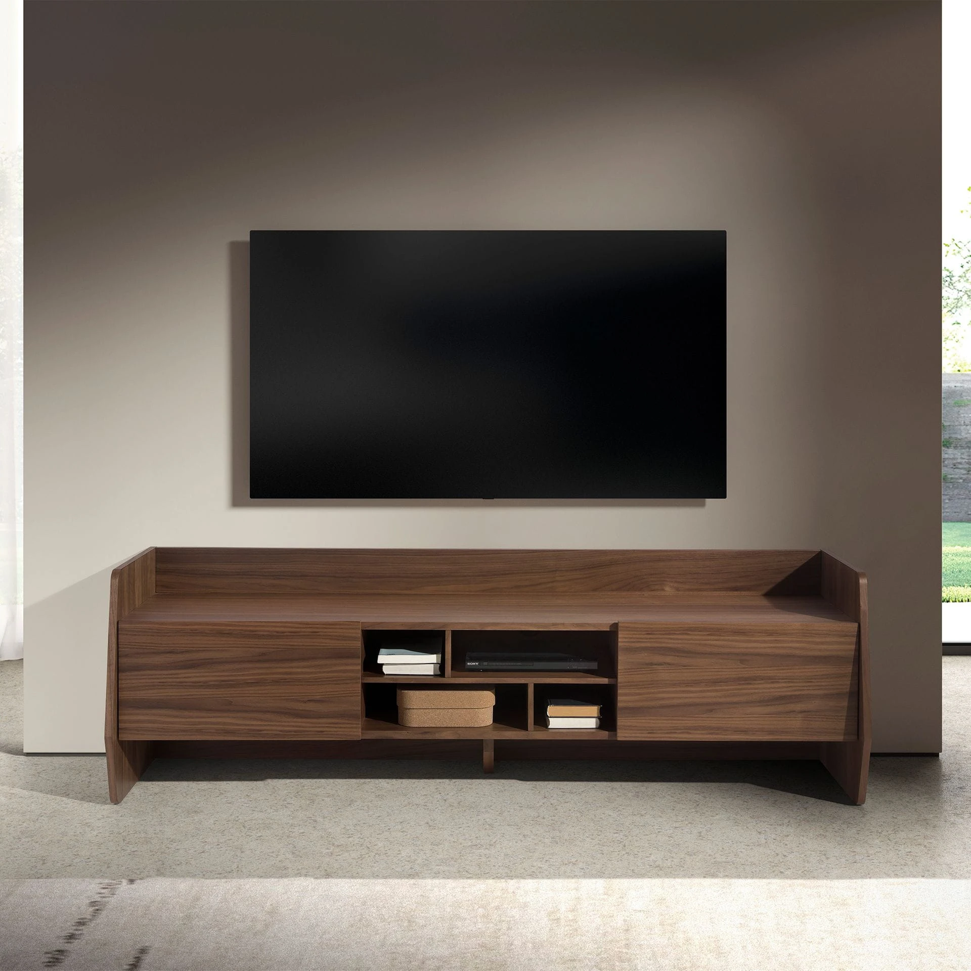 Nowoczesna szafka RTV z naturalną strukturą drewna fornirowanego orzechem. Posiada dużą przestrzeń do przechowywania z systemem cichego zamykania.