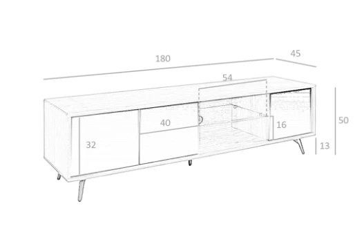 Nowoczesna szafka pod telewizor z drewnianą konstrukcją w naturalnym fornirze orzechowym i oryginalnymi czarnymi nogami ze stali nierdzewnej. Oryginalne detale
