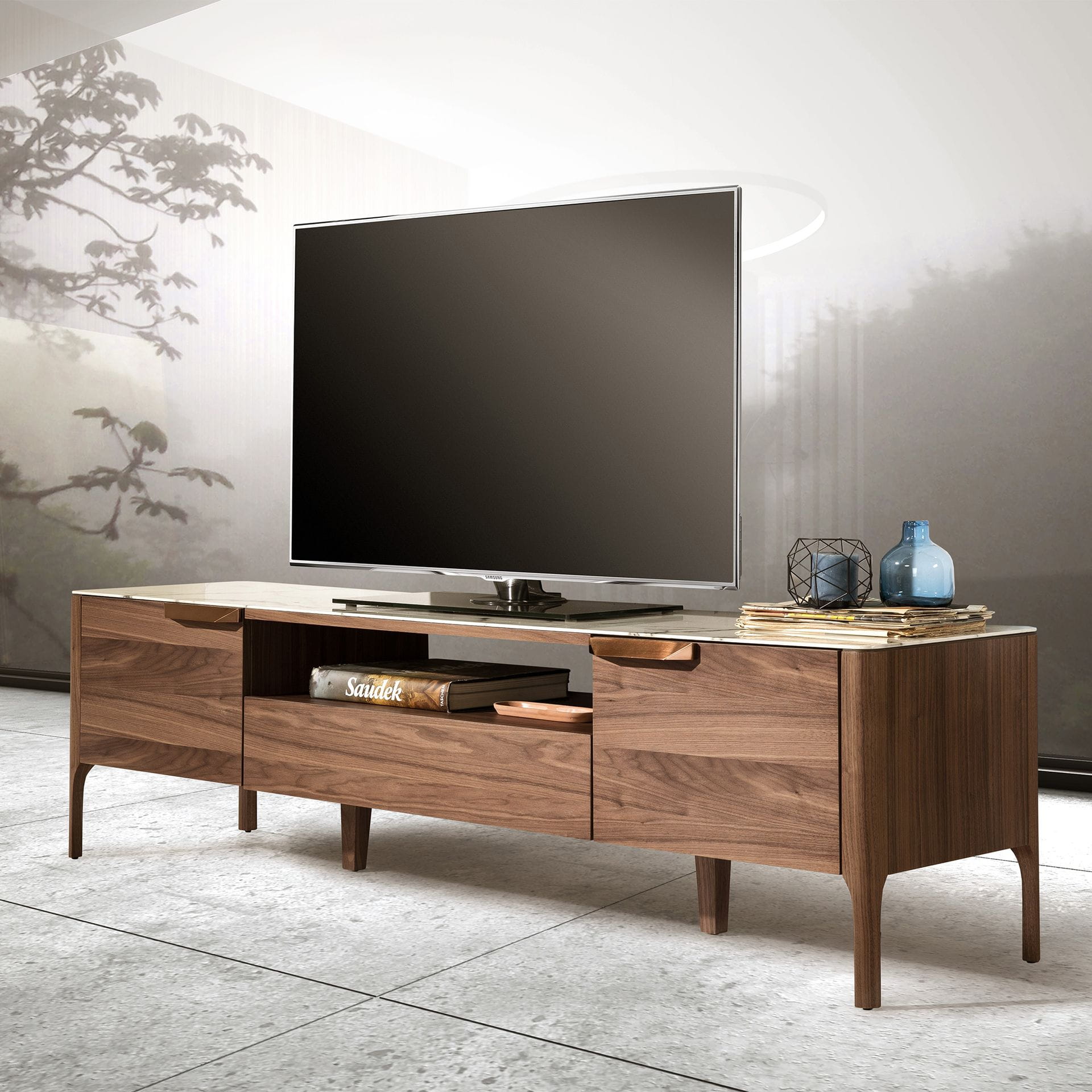Nowoczesna szafka RTV z naturalną strukturą drewna fornirowanego orzechem i oryginalnymi drewnianymi nogami w kolorze orzecha. Dzięki eleganckiemu szklanemu