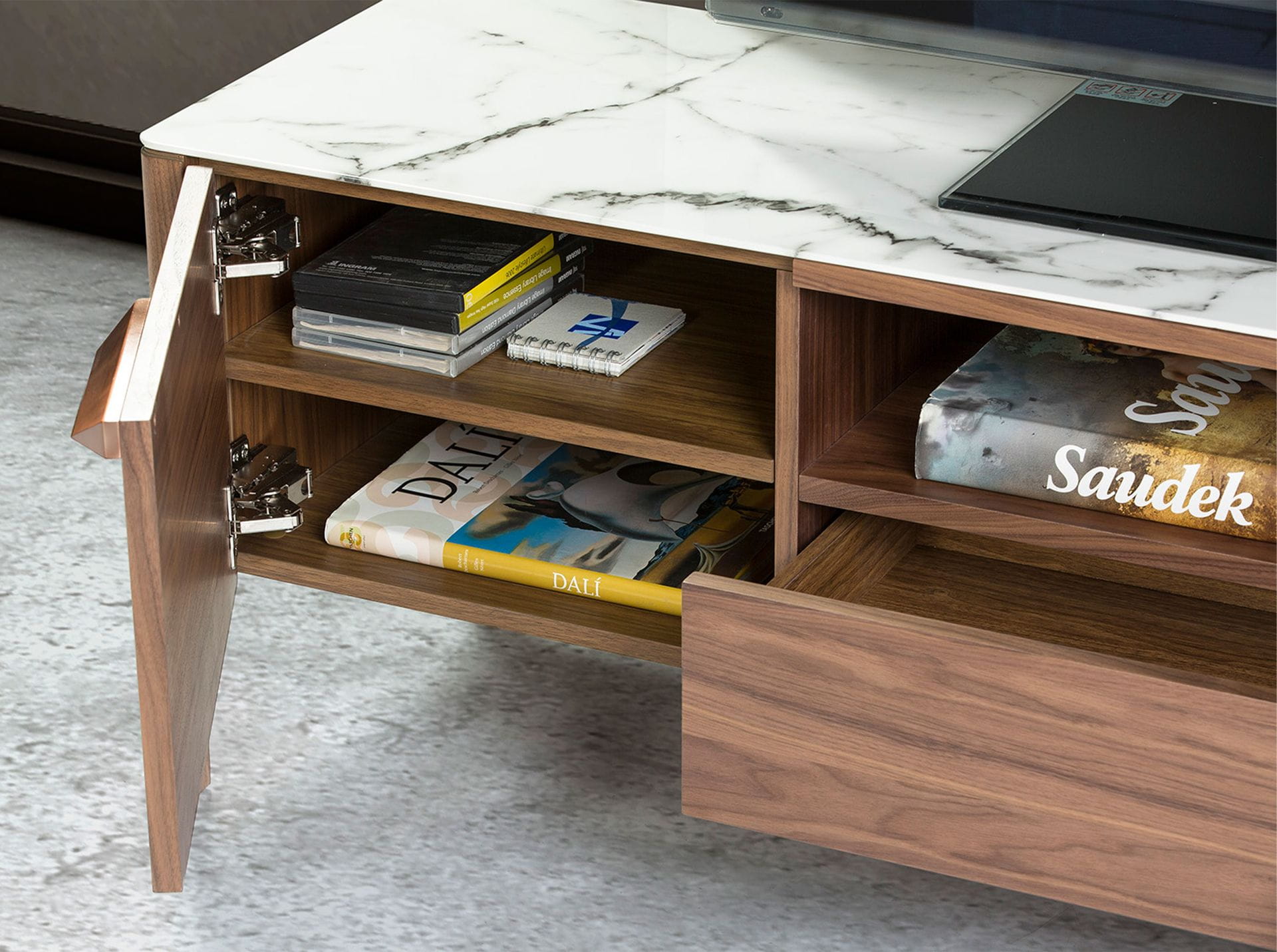 Materiał: drewno fornirowane naturalnym orzechem, szkło porcelanowe imitujące marmur