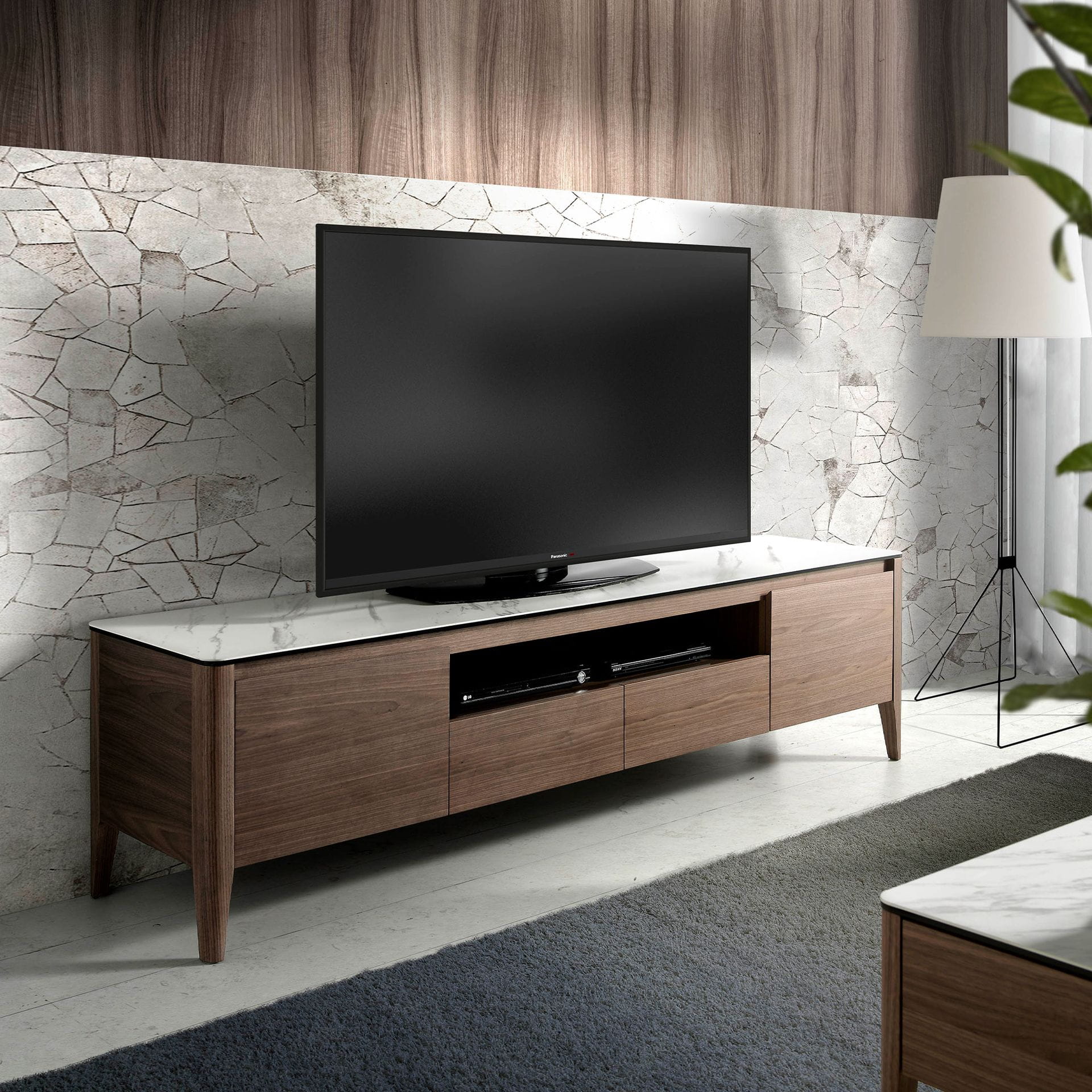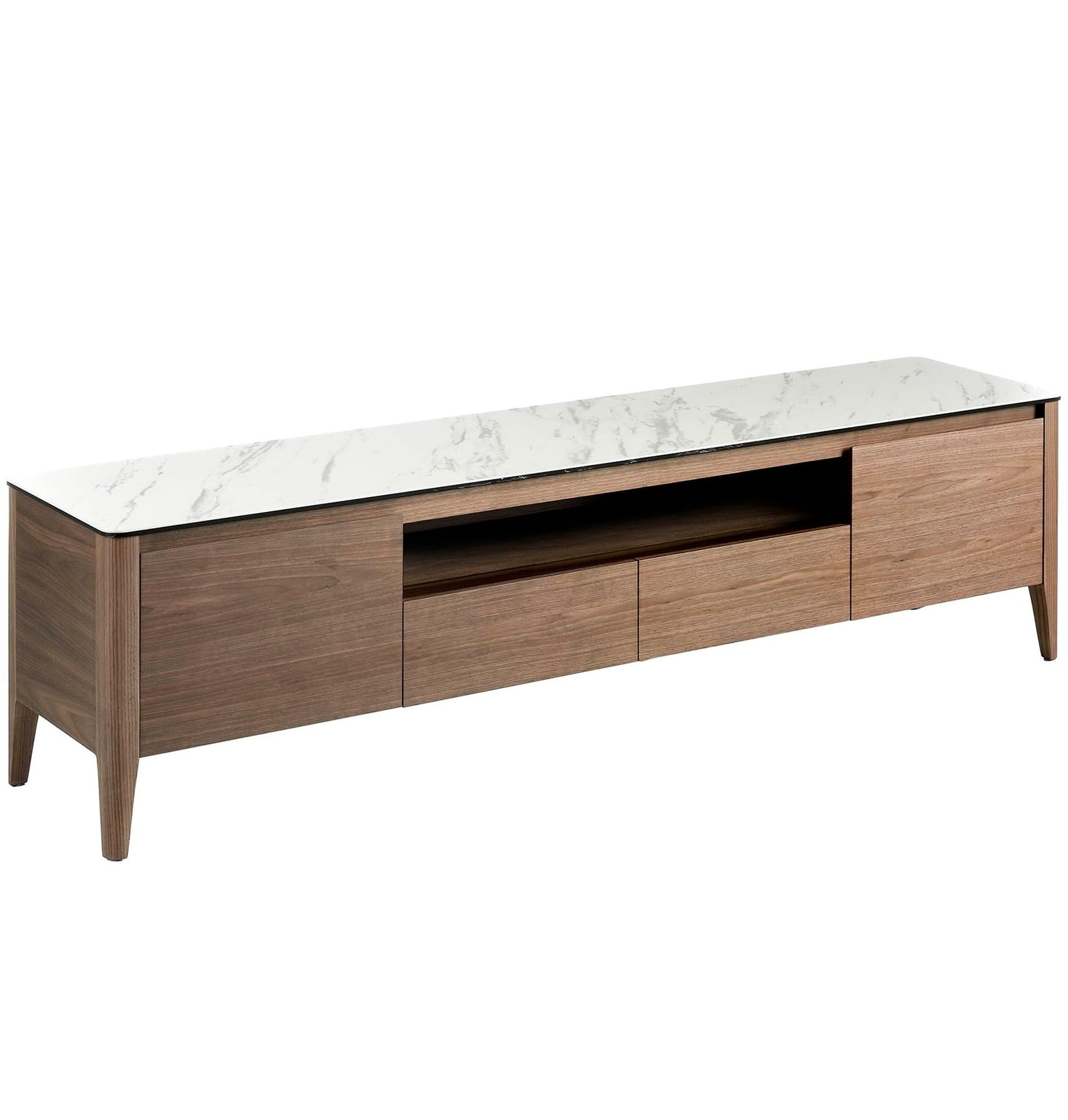 Nowoczesna szafka RTV z naturalną strukturą drewna fornirowanego orzechem i oryginalnymi drewnianymi nogami w kolorze orzecha. Dzięki eleganckiemu szklanemu