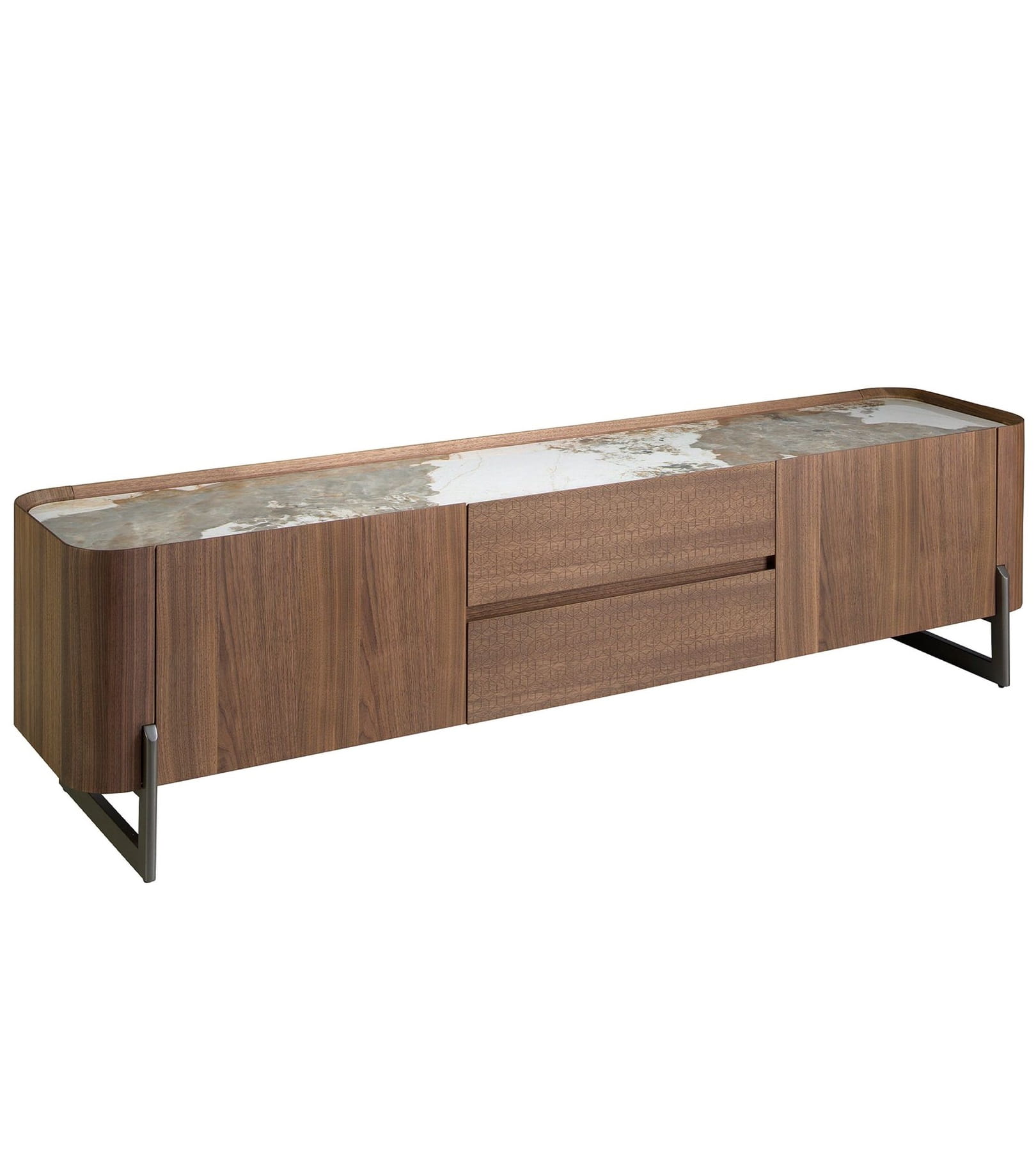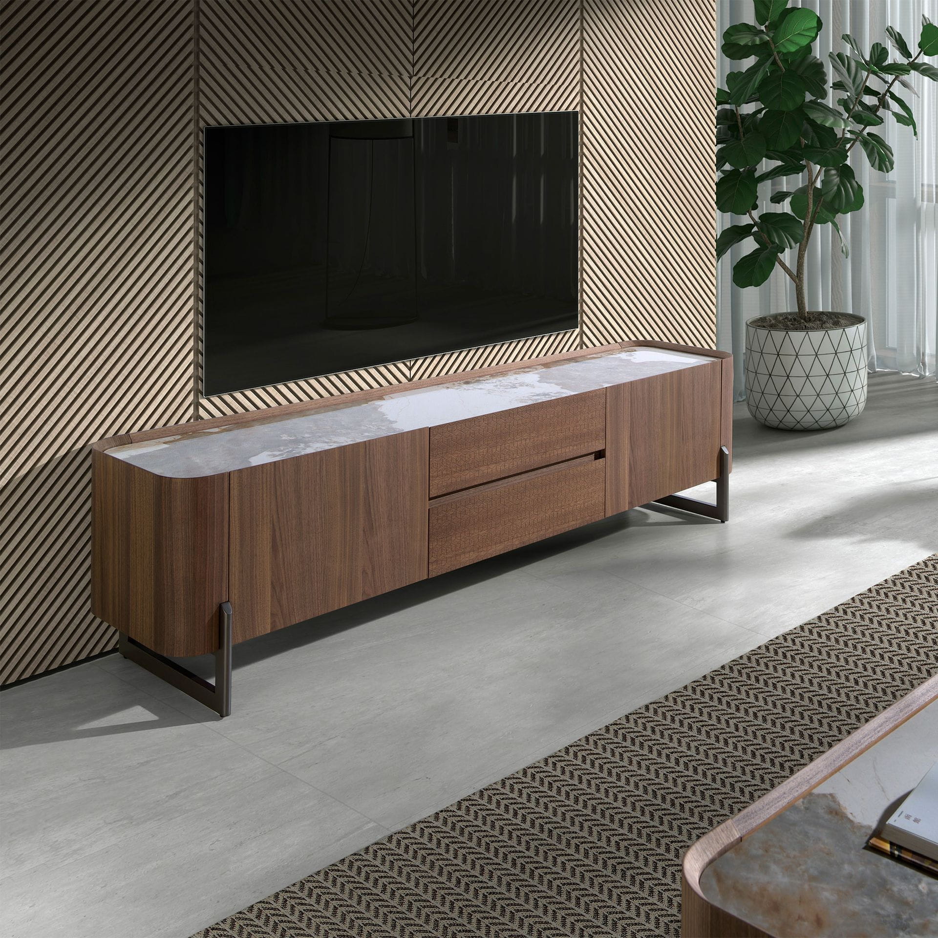 Nowoczesna szafka pod telewizor z naturalną orzechową fornirowaną strukturą drewna i oryginalnymi ciemnymi metalowymi nogami ze stali nierdzewnej. Dzięki